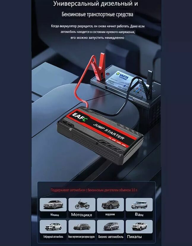 Ниже Вы можете прочитать отзывы на Автомобильное пусковое портативное устройство бустер EAFC 20000mAh 600A, ознакомится с подробными характеристиками, посмотреть интересные обзоры и фотографии на Автомобильное пусковое портативное устройство бустер EAFC 20000mAh 600A.