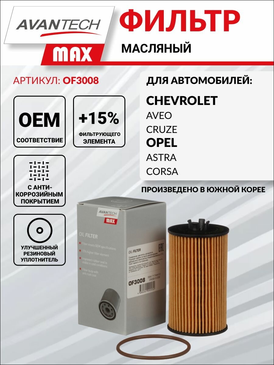 Фильтр масляный Avantech MAX арт. OF3008 для CHEVROLET Aveo Cruze / OPEL Astra Corsa интересное: