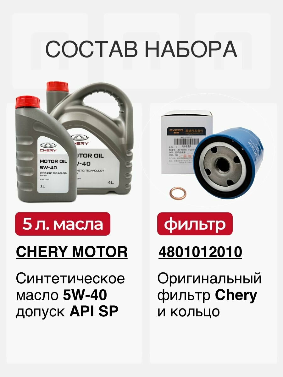 Набор для ТО Chery Tiggo 4, 4 II, 4 Pro, 7, 7 Pro и 8, OMODA C5 и S5, Exeed LX 147 л. с. и 152 л. с. двигатель 1.5 литра турбо SQRE4T15B и SQRE4T15C синтетика Chery 5W40 SP фильтр 4801012010 интересное:
