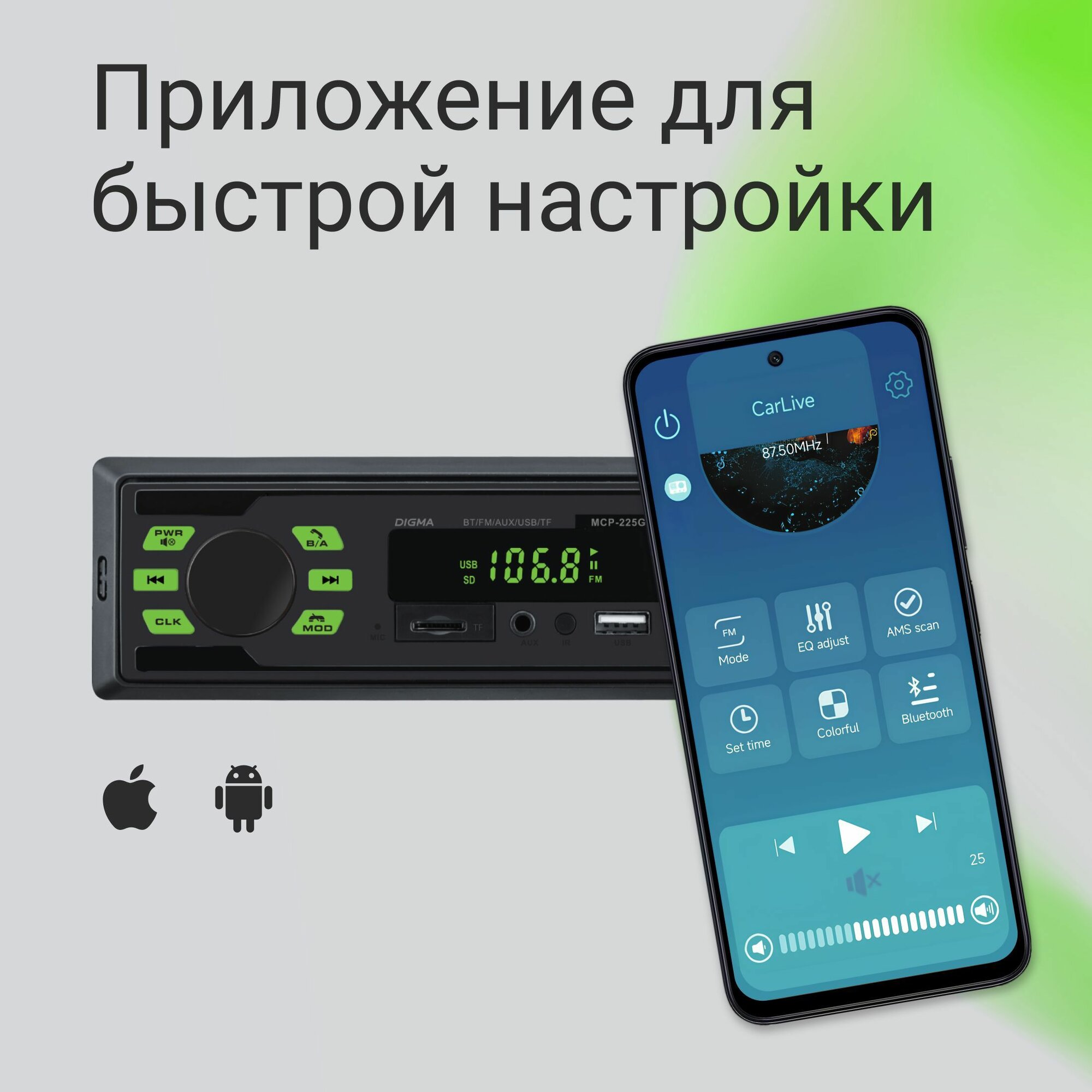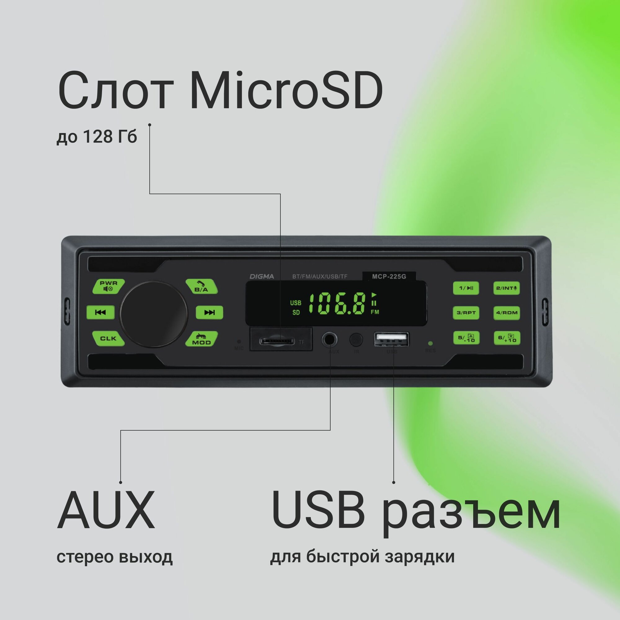 Магнитола для авто с блютуз Digma MCP-225G Bluetooth, 1Din, USB, AUX, зелёная подсветка интересное: