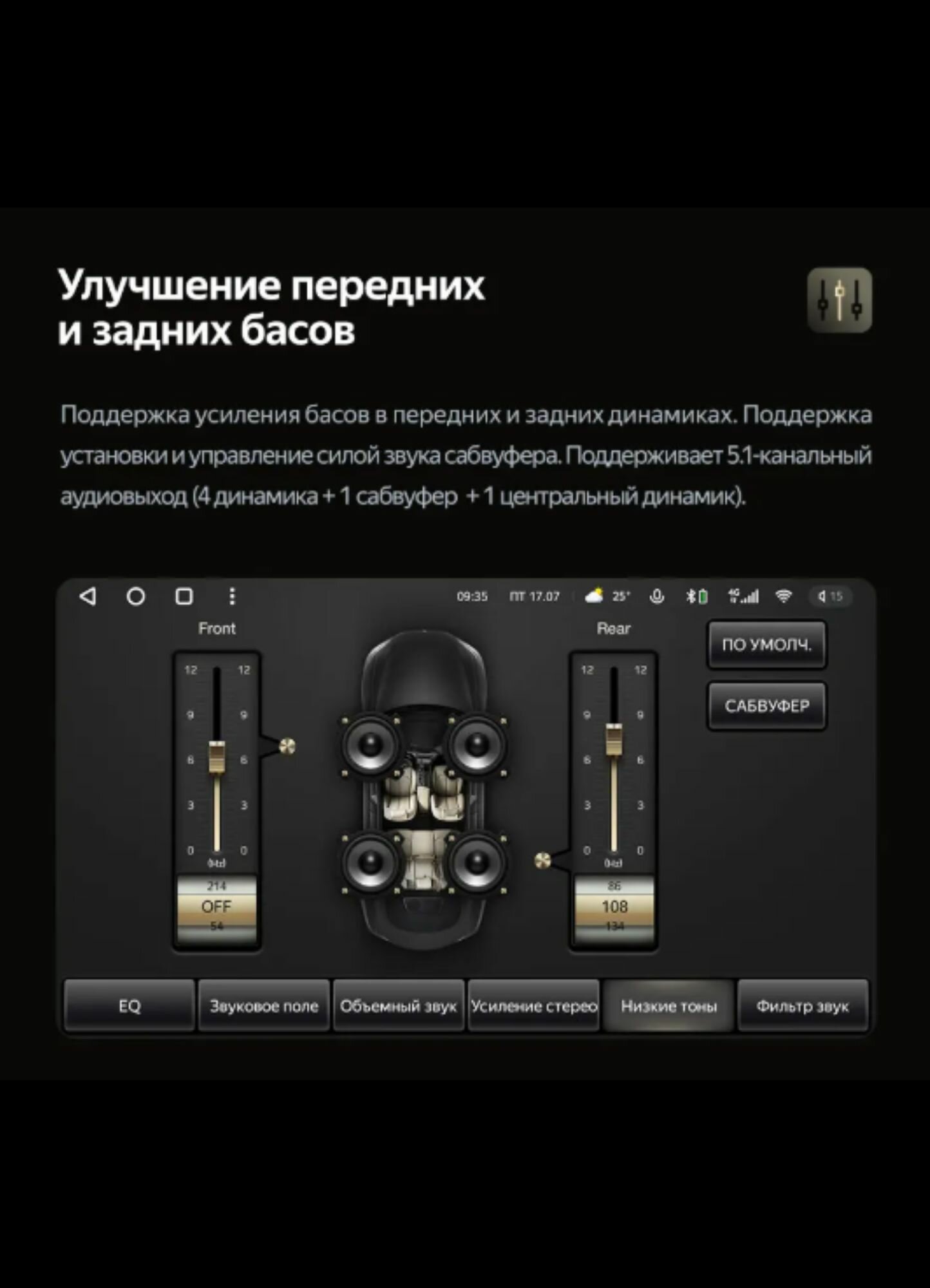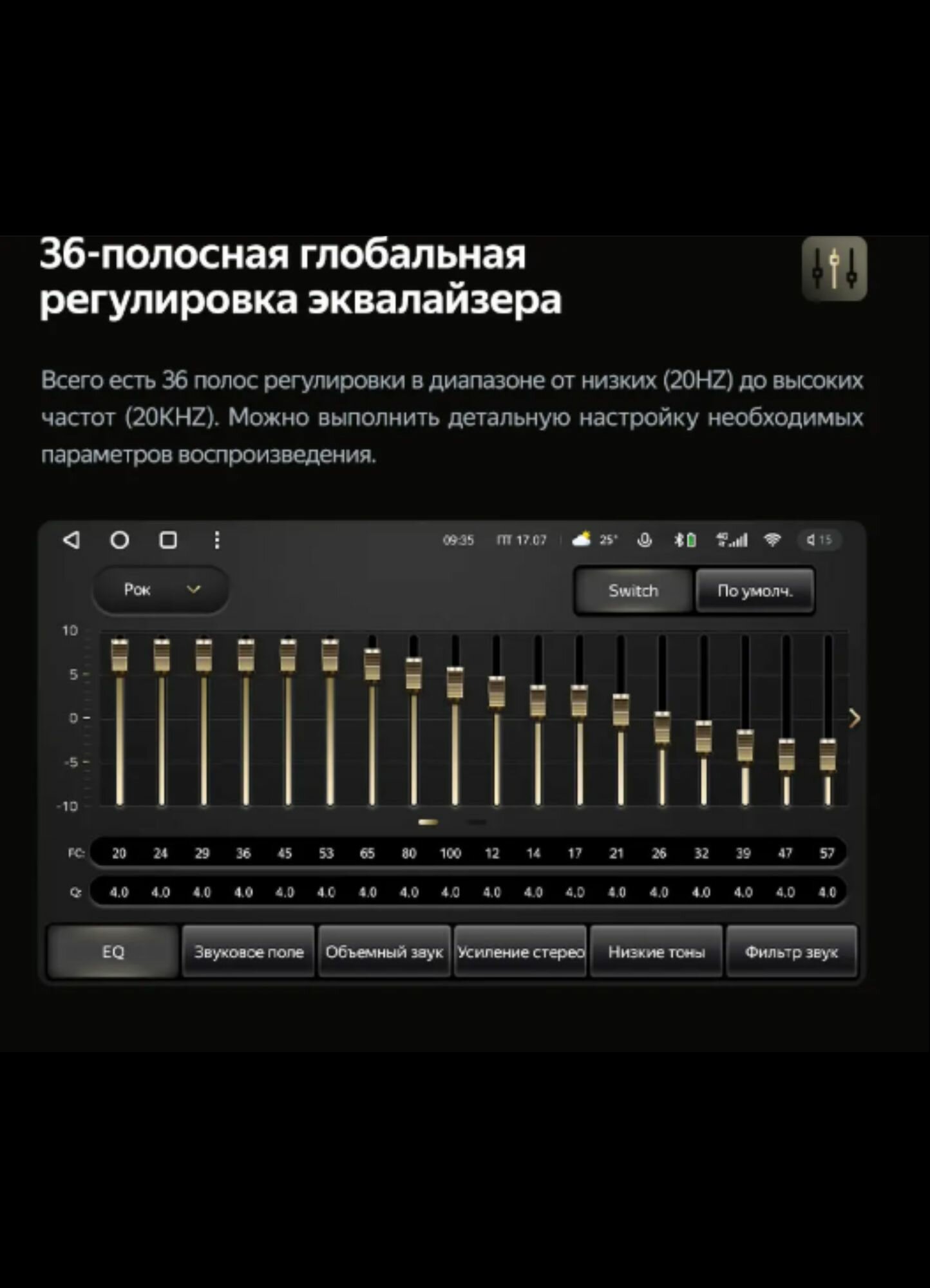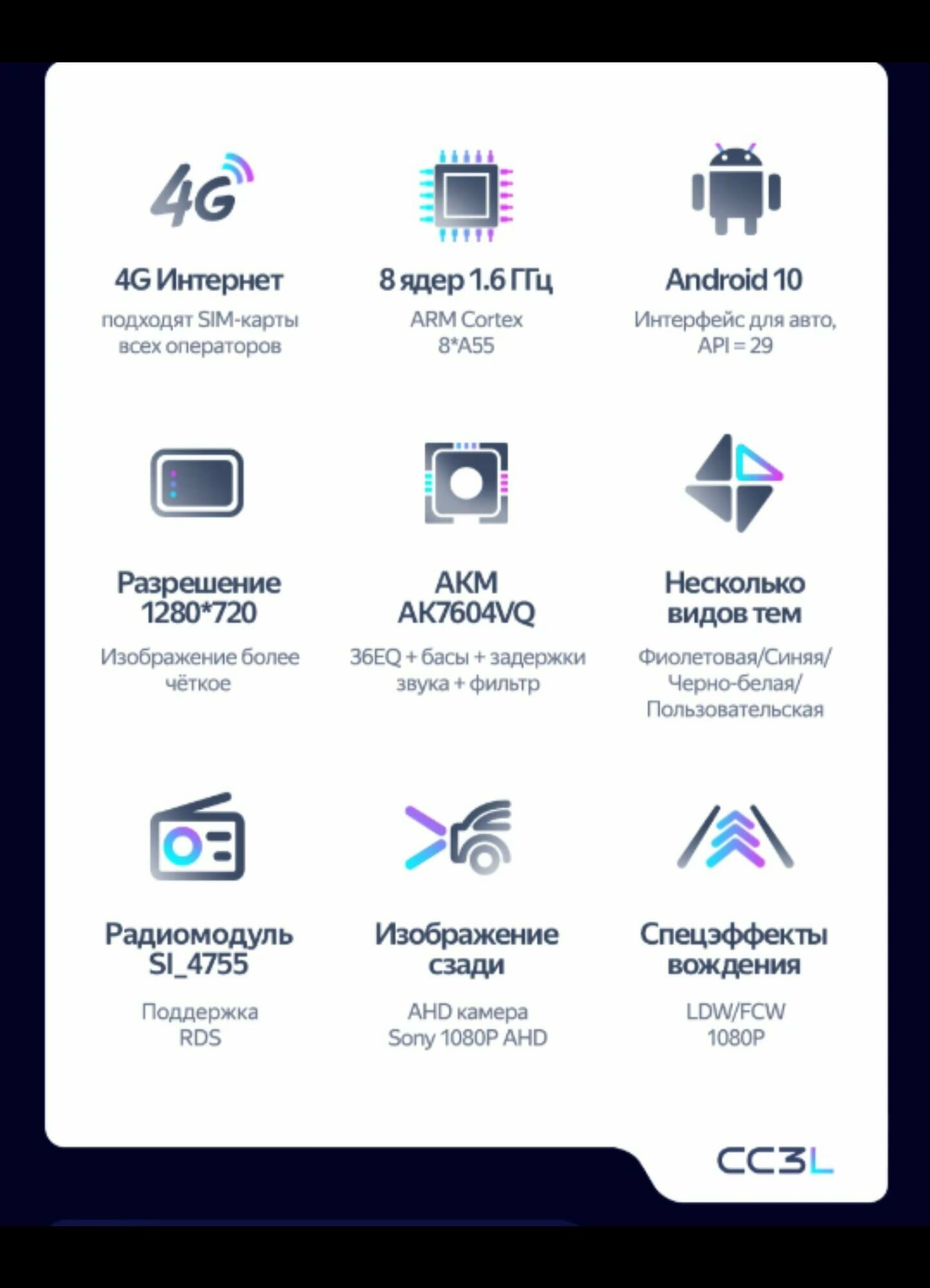 | Особенности | ОС Android, Обновление ПО, Поддержка Android, Поддержка CarPlay, Поддержка IOS, Поддержка камеры заднего вида, Поддержка кириллицы, Поиск по файлам, Процессорная, Управление с кнопок на руле (SWC) |