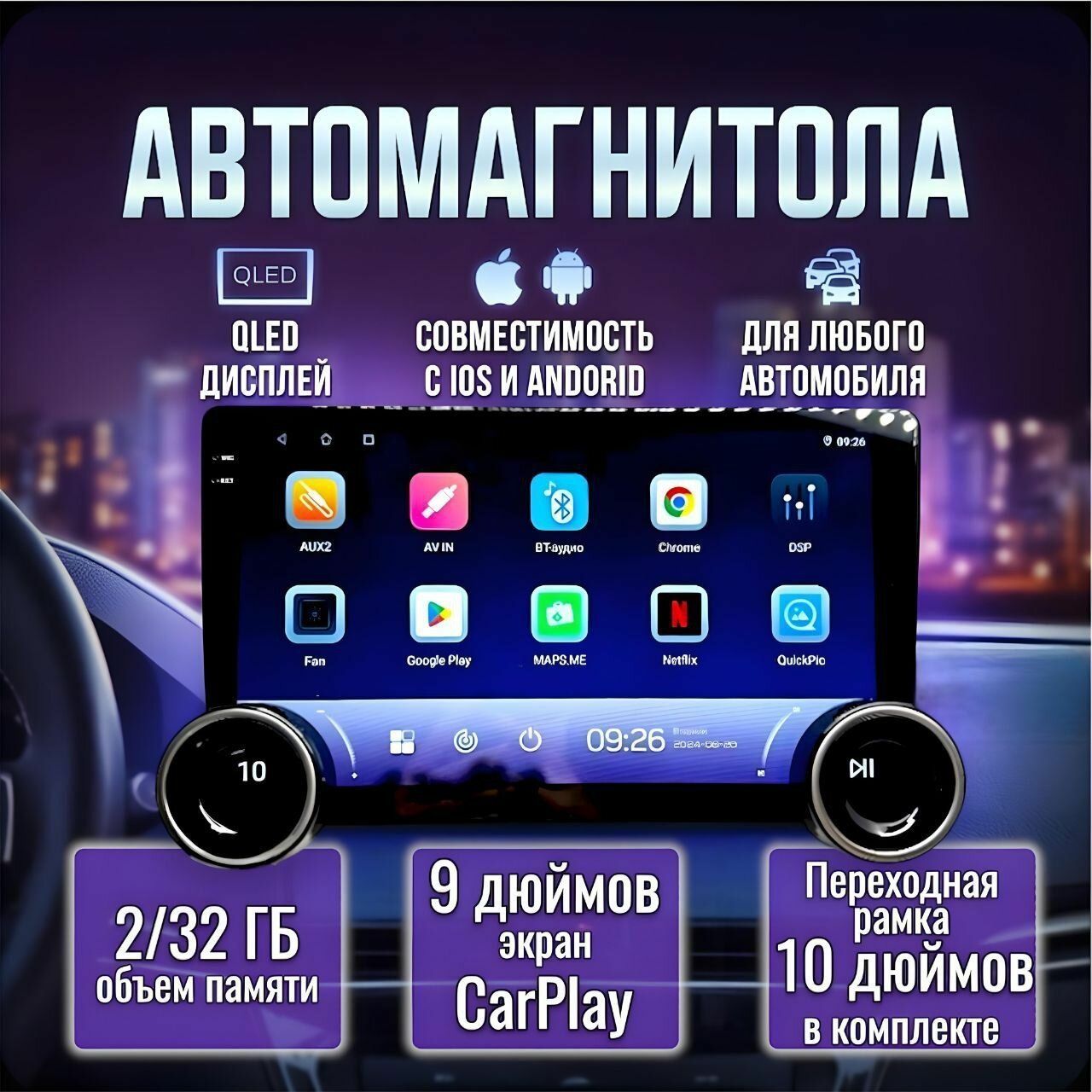 Автомагнитола универсальная Android 4+64Гб, c навигатором и блютус 9 дюймов (10.3", DSP, GPS, Wi-Fi, CarPlay, Bluetooth, Кулер охлаждения) интересное: