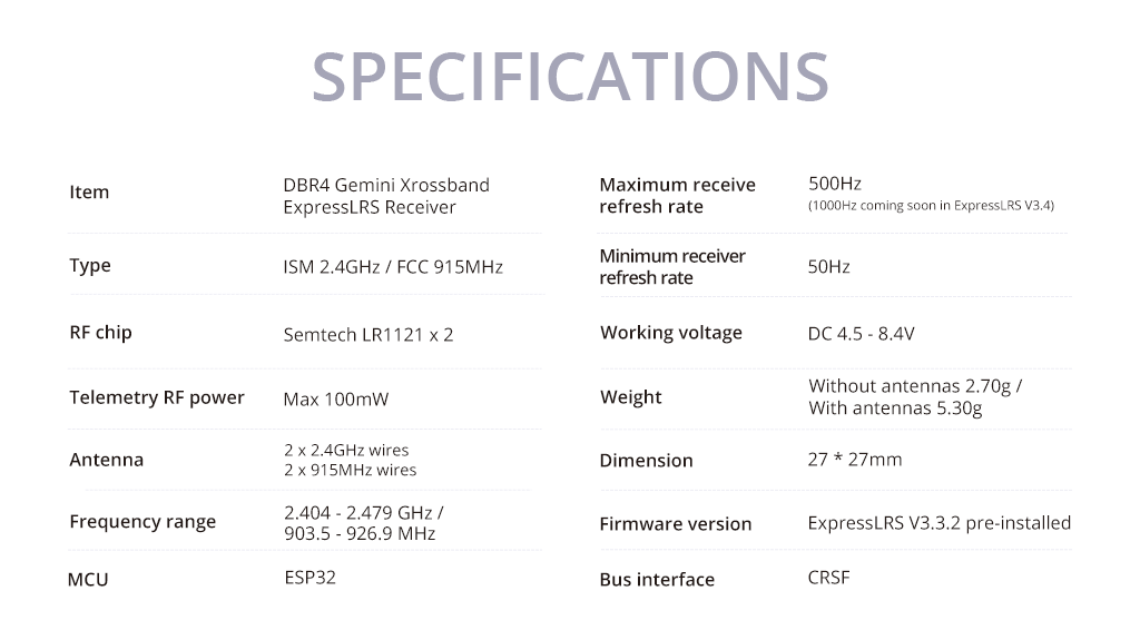 | Дополнительная информация | Если у вас уже есть Nomad Dual Gemini, то приёмник DBR4 станет идеальным дополнением, раскрыв весь потенциал двухдиапазонного ELRS. Вместе они формируют полноценную экосистему Gemini Xrossband, где сигналы обмениваются сразу на двух частотах, что даёт беспрецедентную устойчивость и скорость передачи данных. |