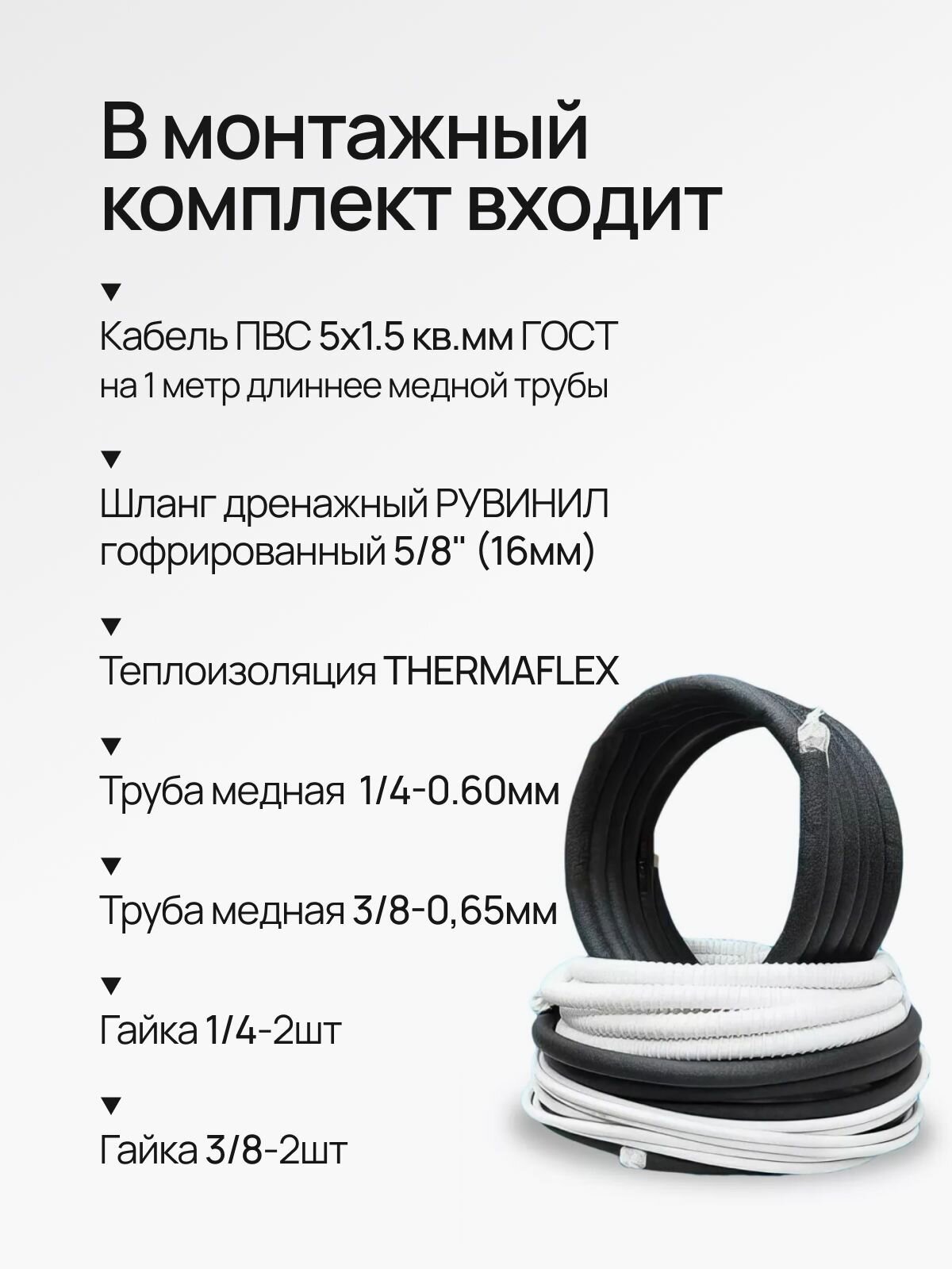 | Подробная комплектация | Труба медная 1/4", труба медная 3/8" в изоляции, гайки, шланг дренажный 5/8", кабель ПВС, упаковка |