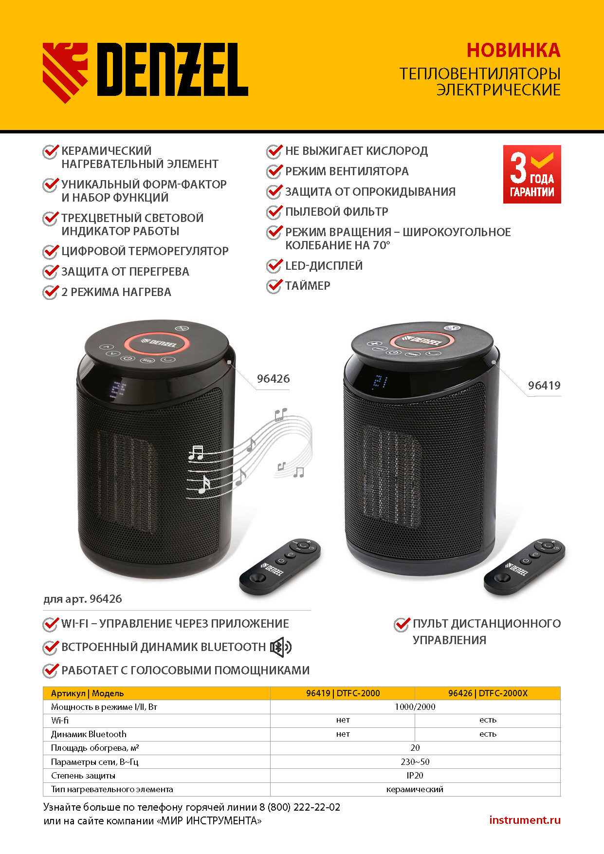Тепловентилятор электр. керамический Denzel DTFC-2000 пульт, 3 реж, вент, нагрев 1000/2000 Вт 96419 интересное: