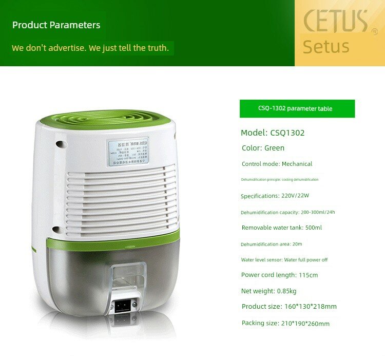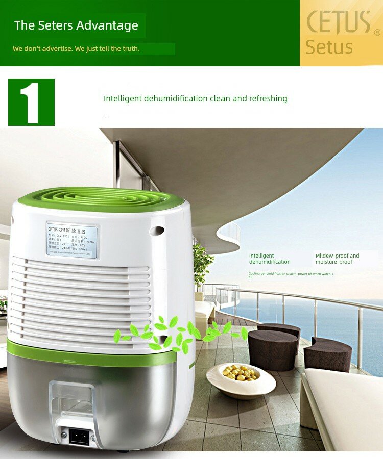 | Дополнительная информация | 220В/25Вт, мощность осушения: 200-300мл/24ч, съемный резервуар для воды: 500мл, датчик уровня воды: автоматическое отключение питания при заполнении водой, длина шнура питания: 115см |