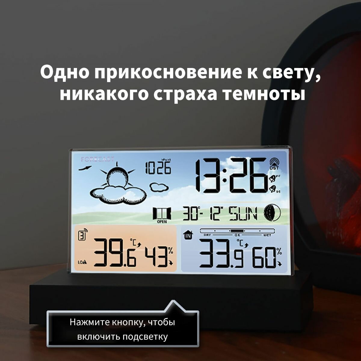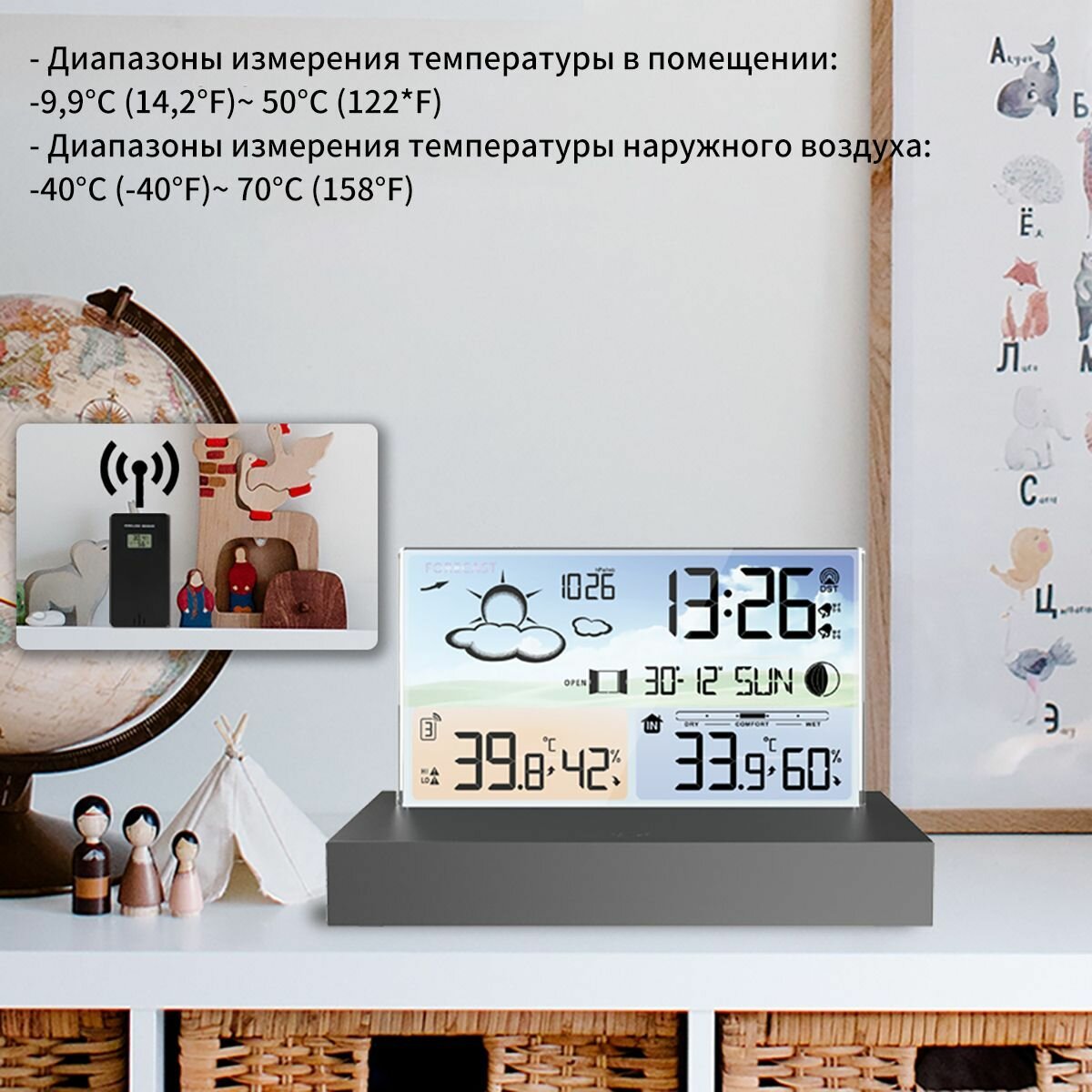 | Комплектация | Material: ABS Color: Black+Clear glass Waterproof: IPX4 Power Supply: Weather Station *2 AAABattery(not included) or USB cable; Remote Sensor*2 AABattery(not included) Package Size:16.5*12*8cm / 6.5*4.7*3.1in Package Weight: 453g / 16oz Packing List: 1 * Digital Alarm Clock 1 * USB Cable 1 * Sensor 1 * User Manual (En, DR, FR,ES, IT) |