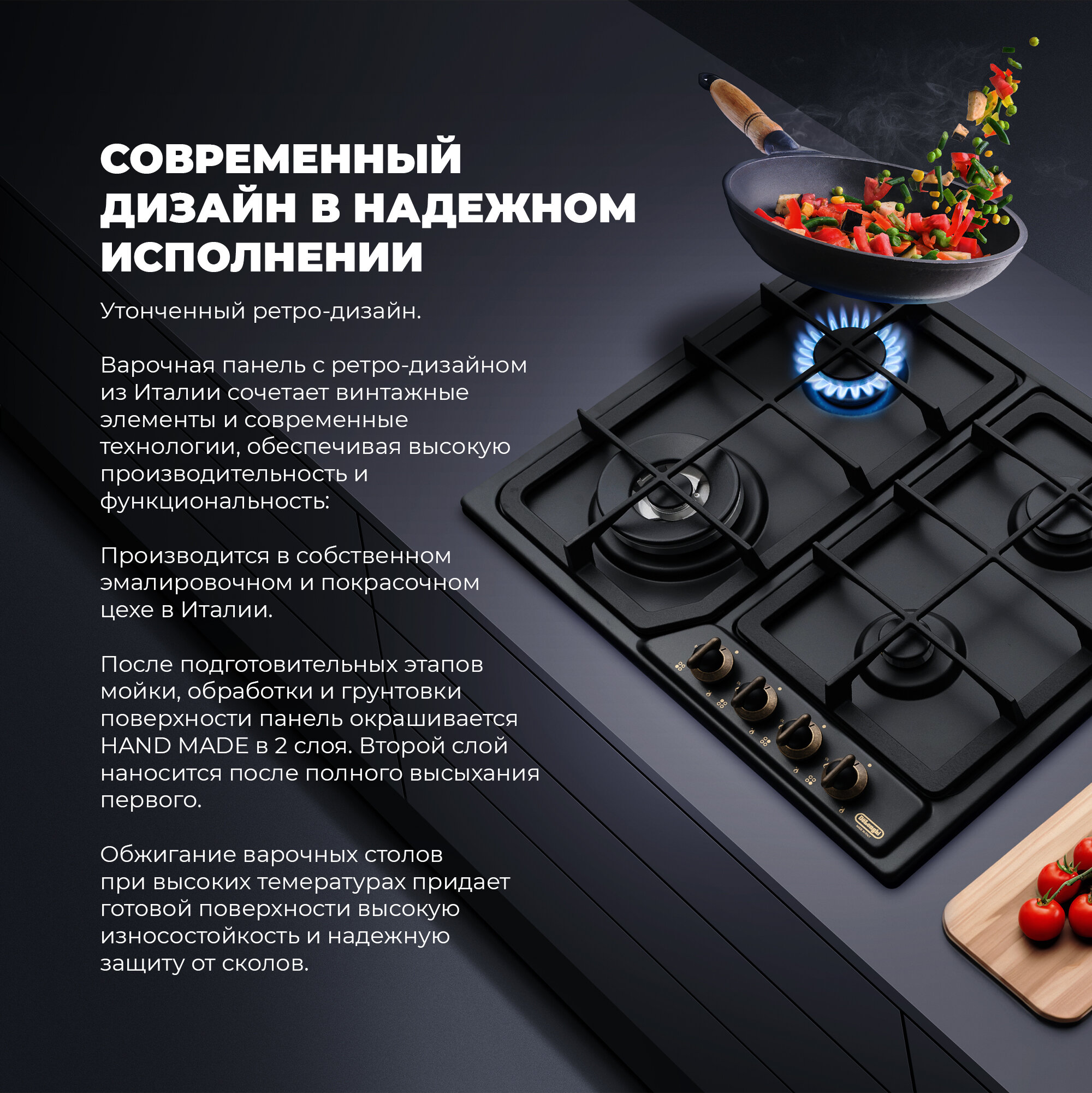 Варочная панель газовая 60 см DeLonghi GRETA 6GW NB, WOK-конфорка, чугунные решетки, автоматический розжиг, газ-контроль