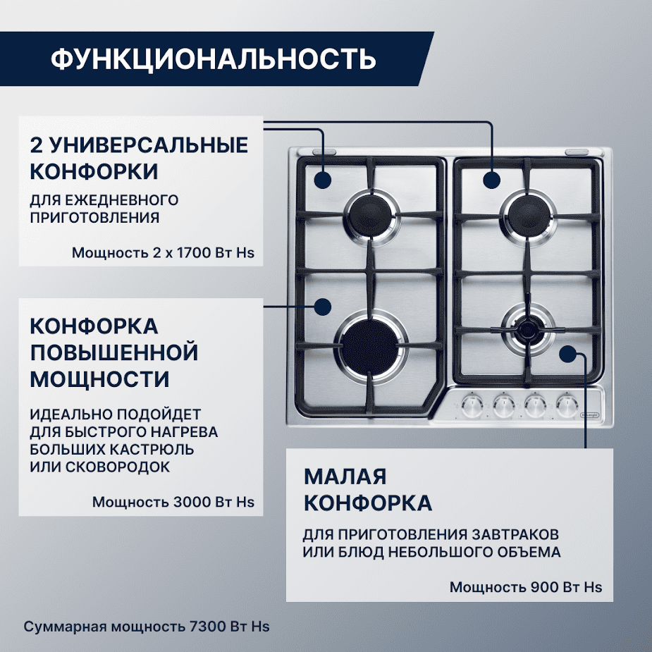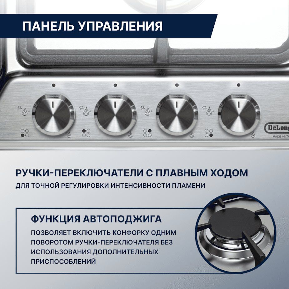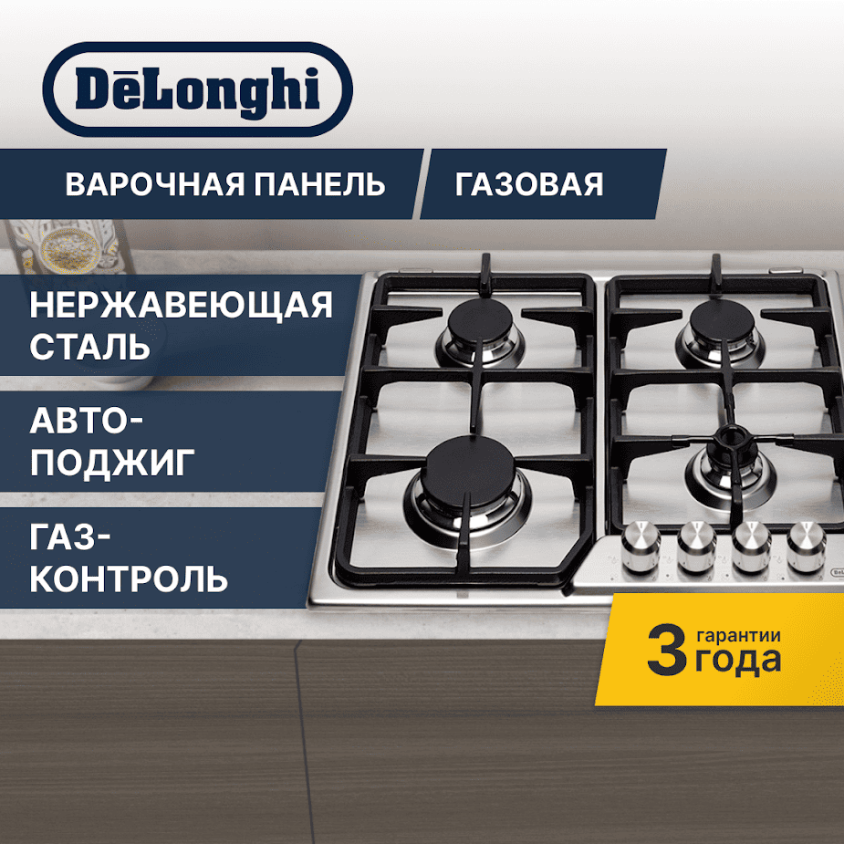 Газовая варочная панель на четыре конфорки Delonghi SLF 460 LX RUS нержавеющая сталь