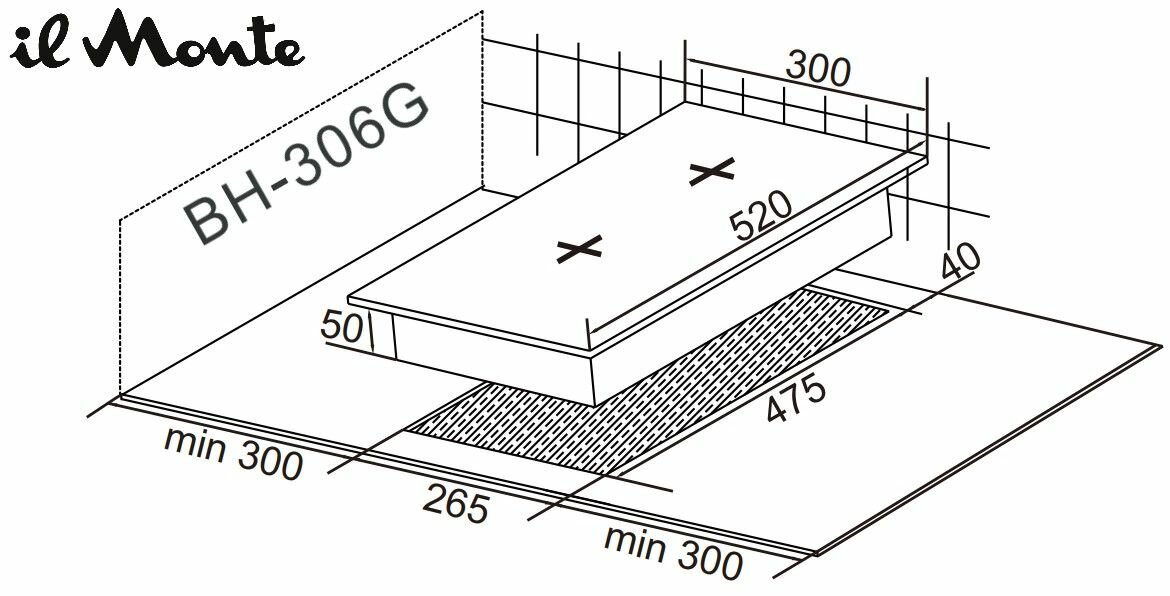 | Размеры, мм | Размеры варочной поверхности (В х Ш х Г), мм: 50 х 300 х 520 |