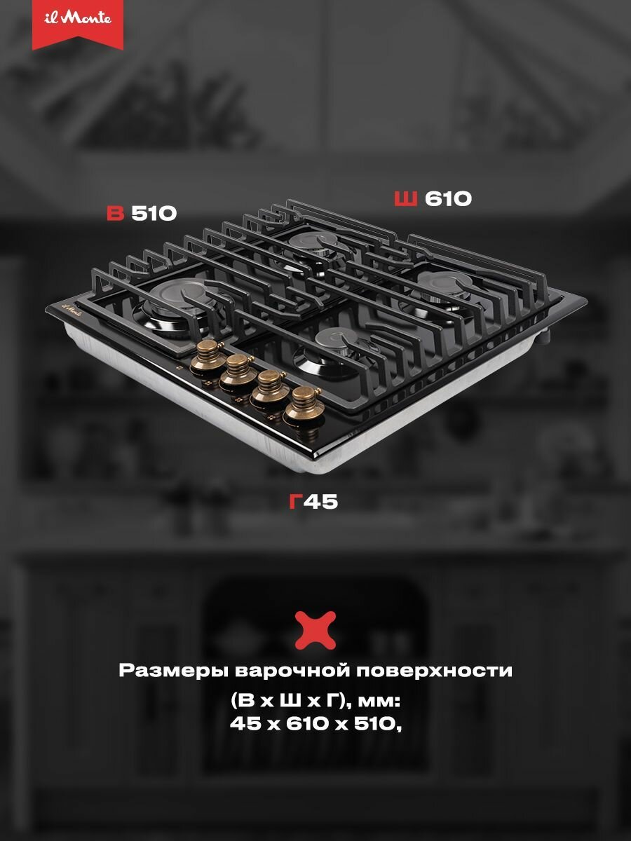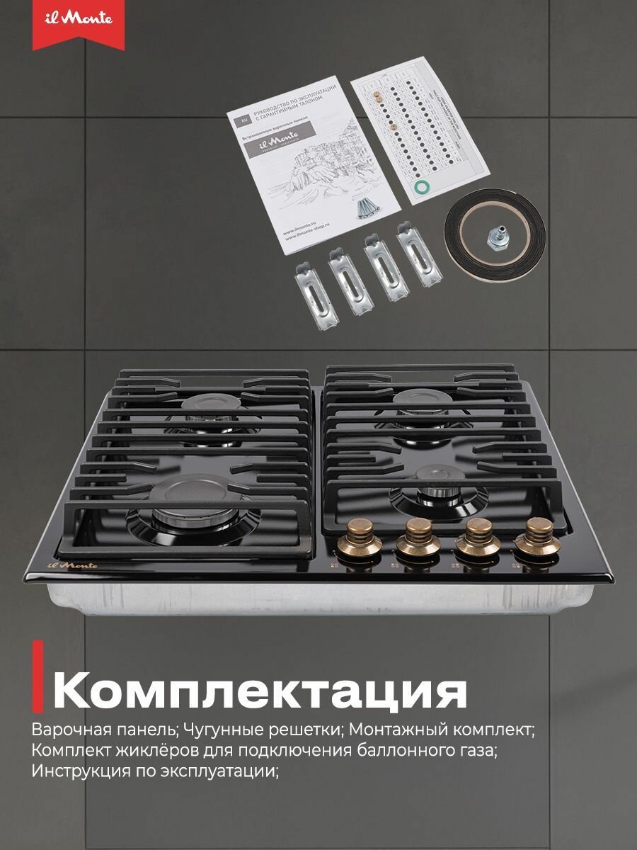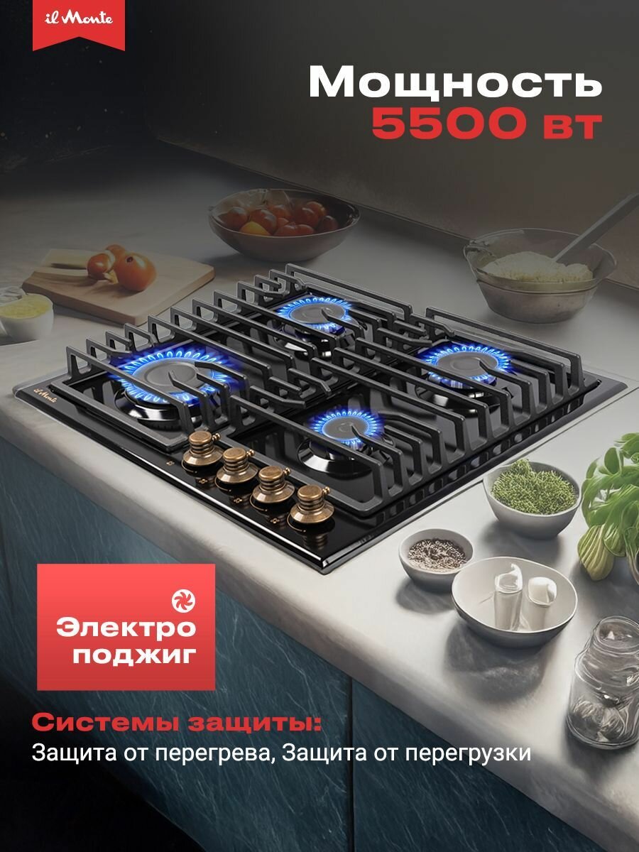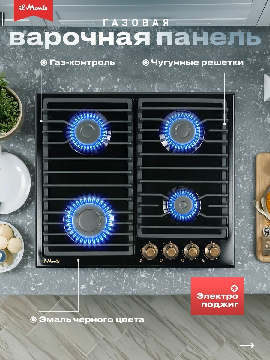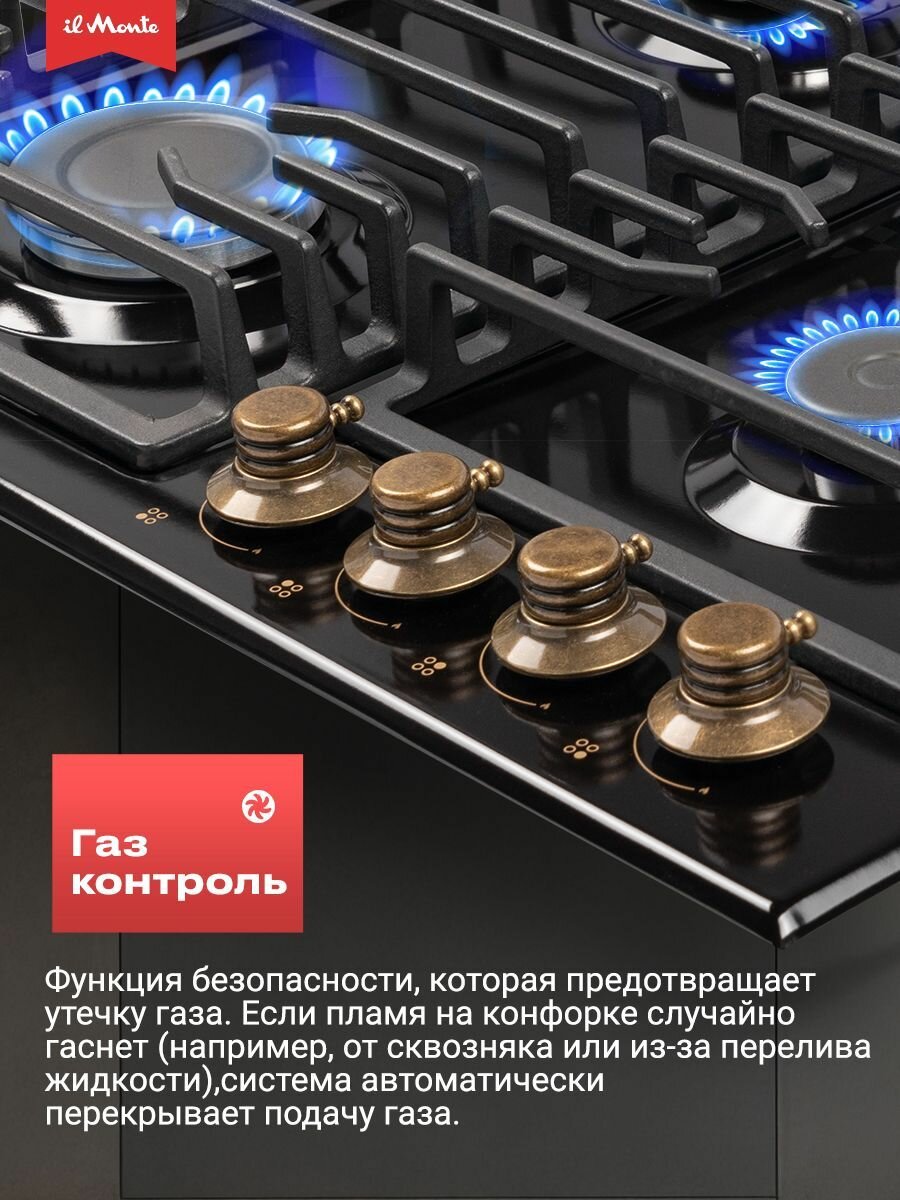 Варочная панель газовая, Деревенский, Рустик (RUSTICO), Газ-контроль, Чугунные решетки, газовая il Monte BH-676E-RUSTICO интересное:
