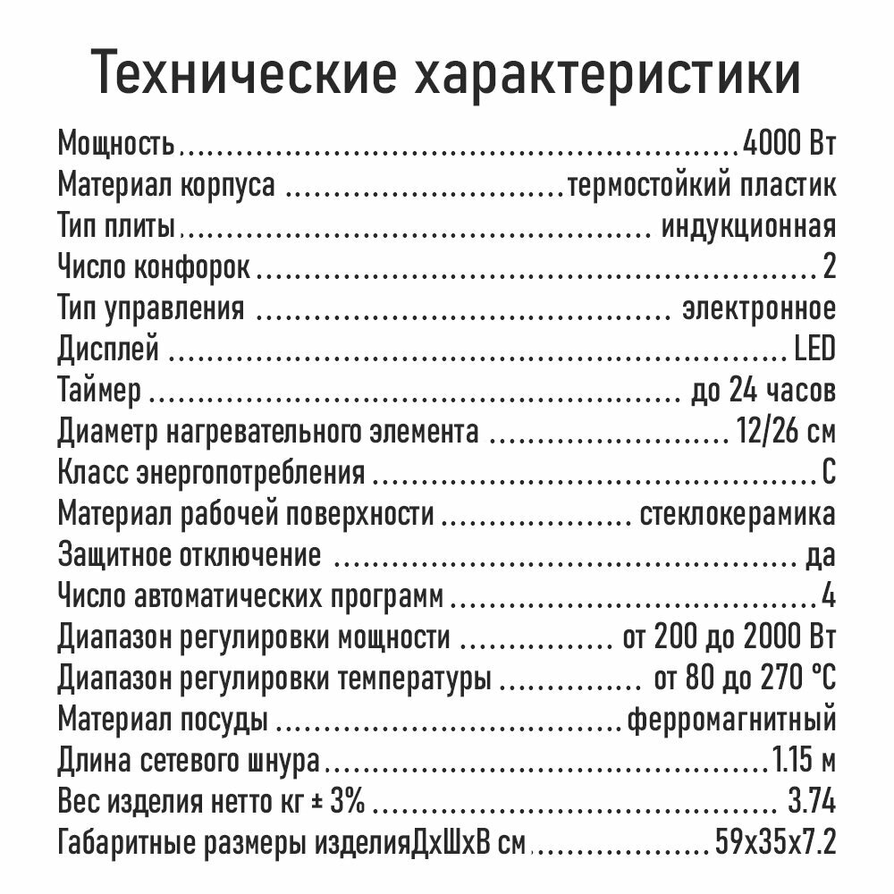 | Число индукционных конфорок | 2 |