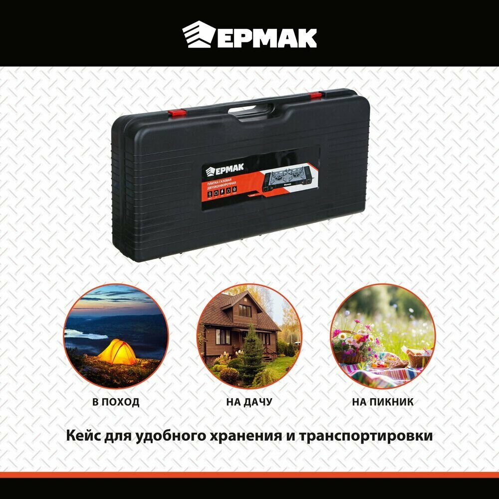 Купить Плитка газовая двухкомфорочная портативная с переходником ермак, 63х10,5х27,5см, в кейсе