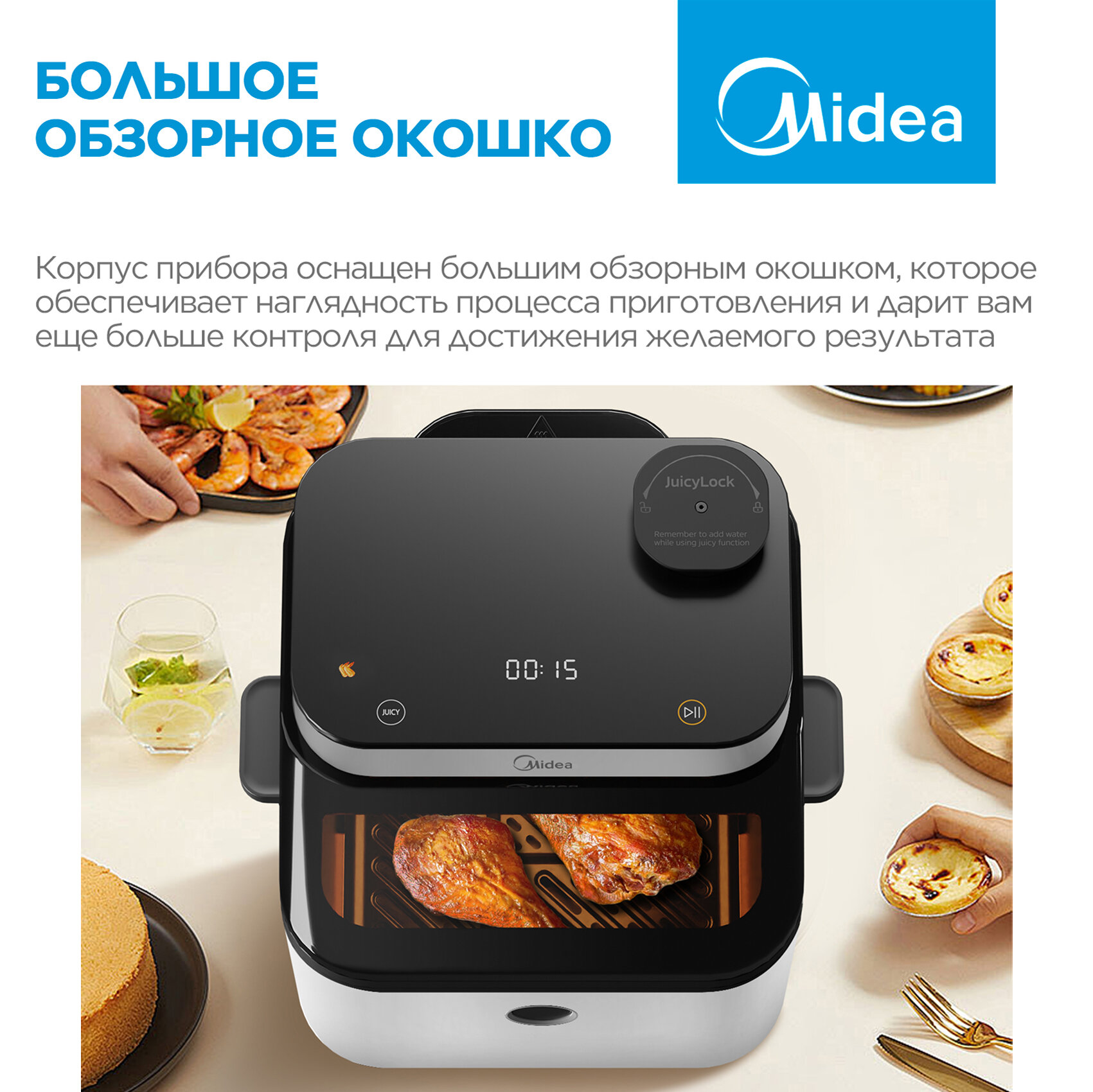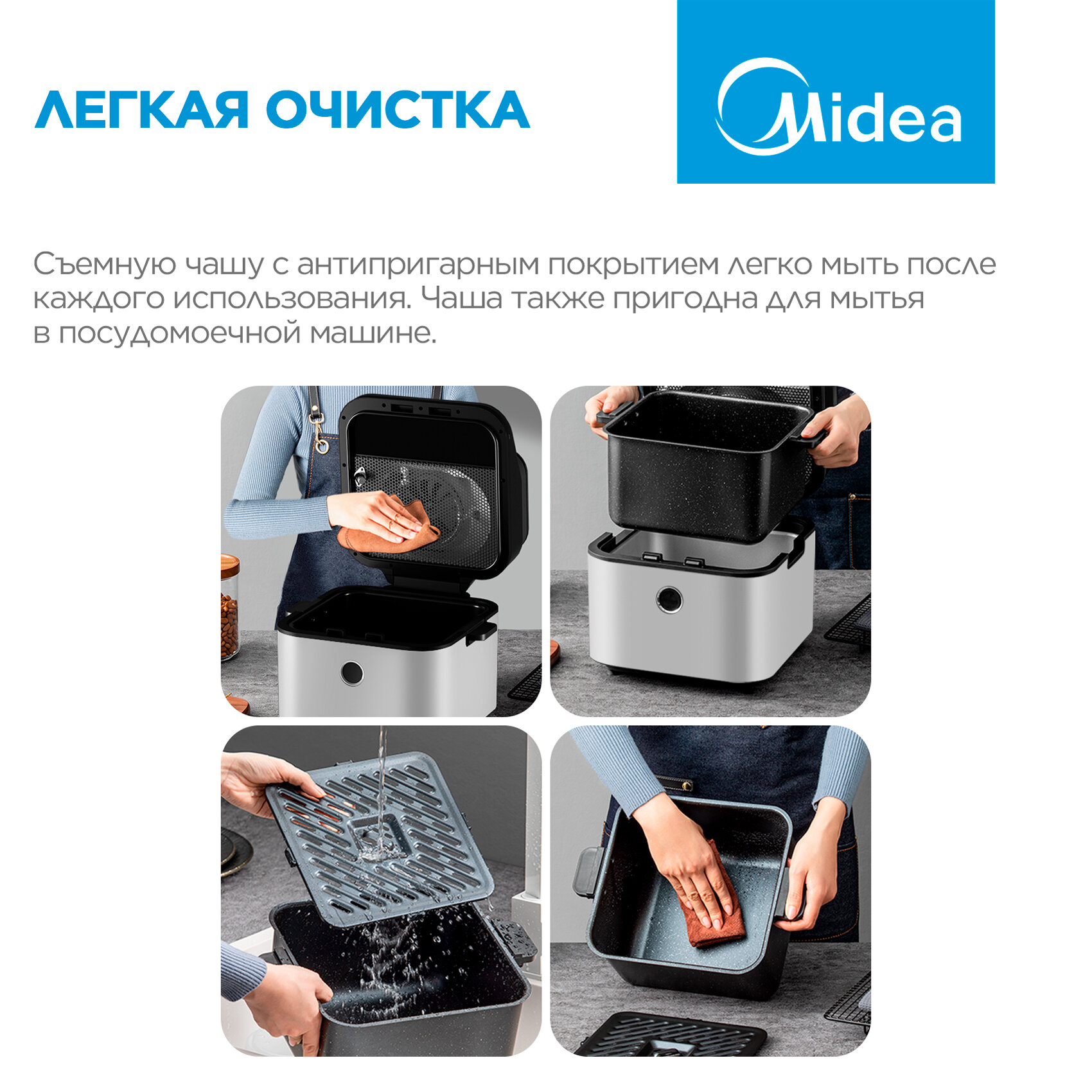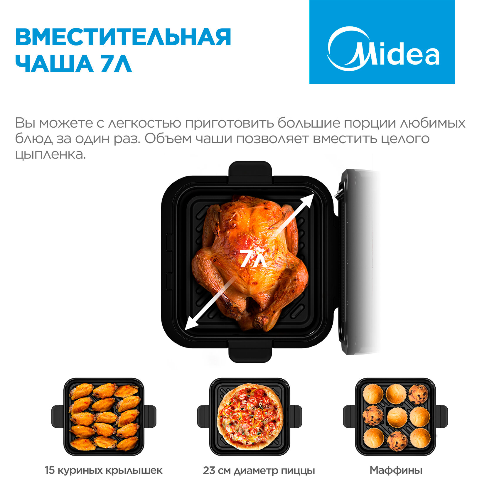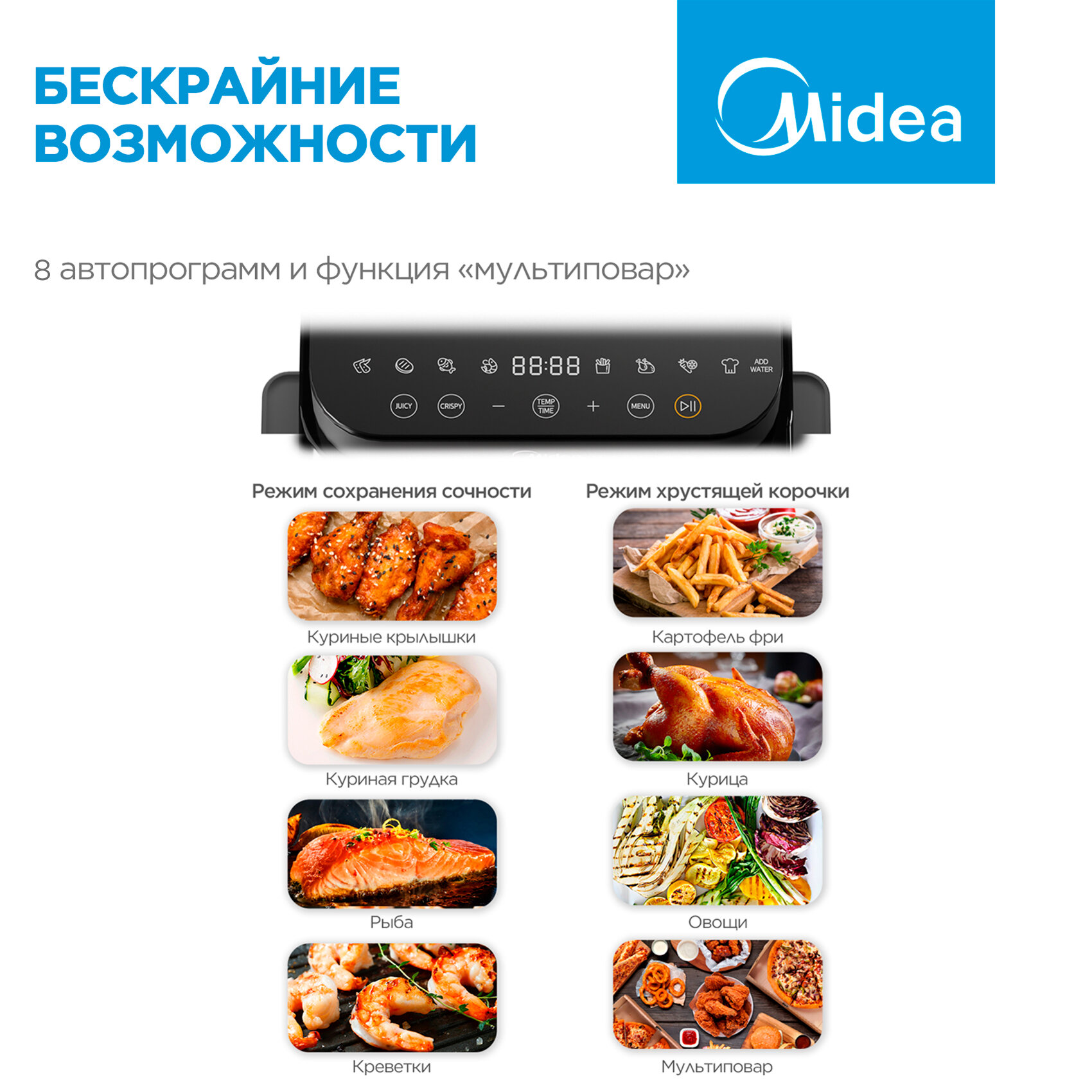 Аэрогриль Midea MAF-1075W, 1450 Вт, 7 литров, 8 автопрограмм, сенсорное управление, антипригарное покрытие чаши, белый интересное: