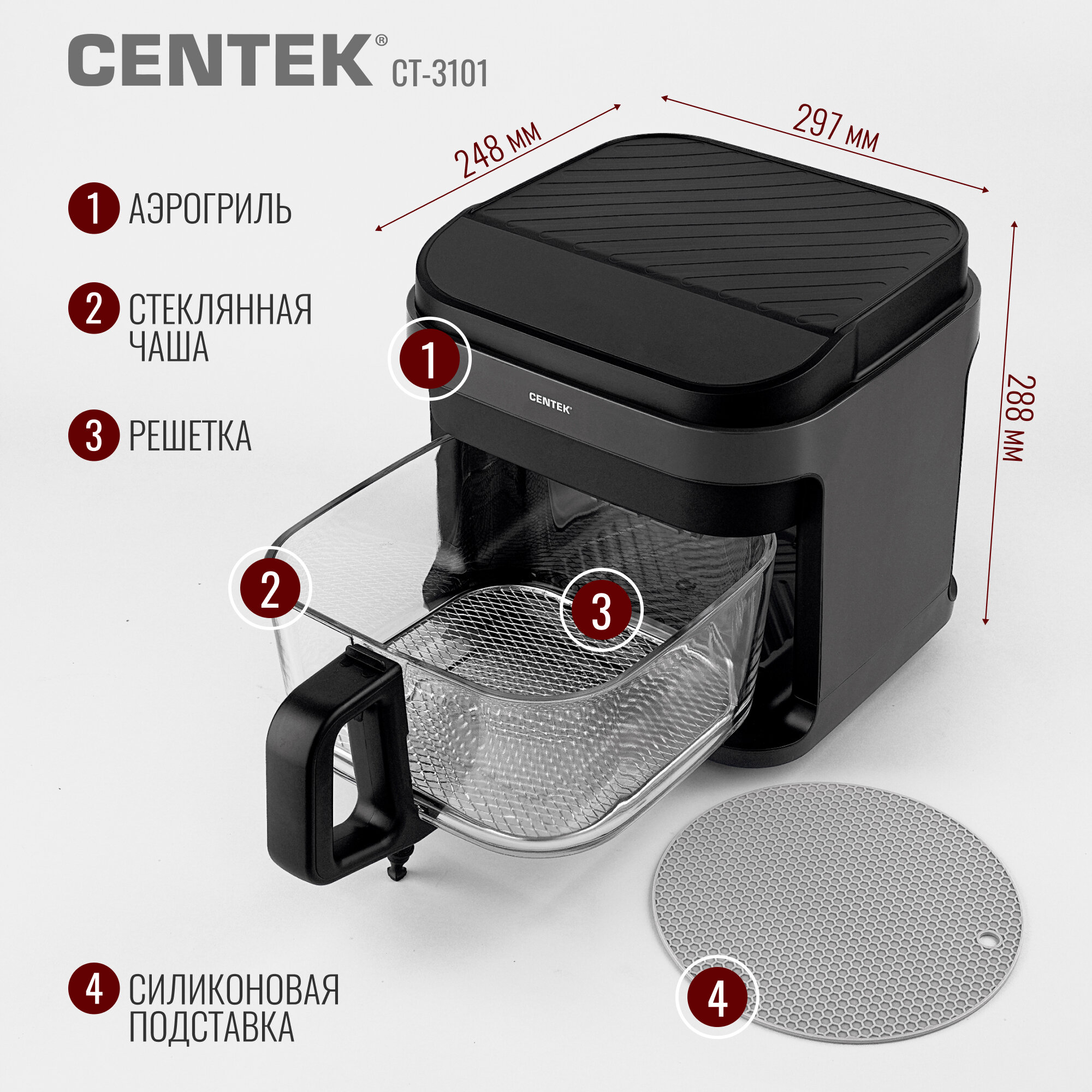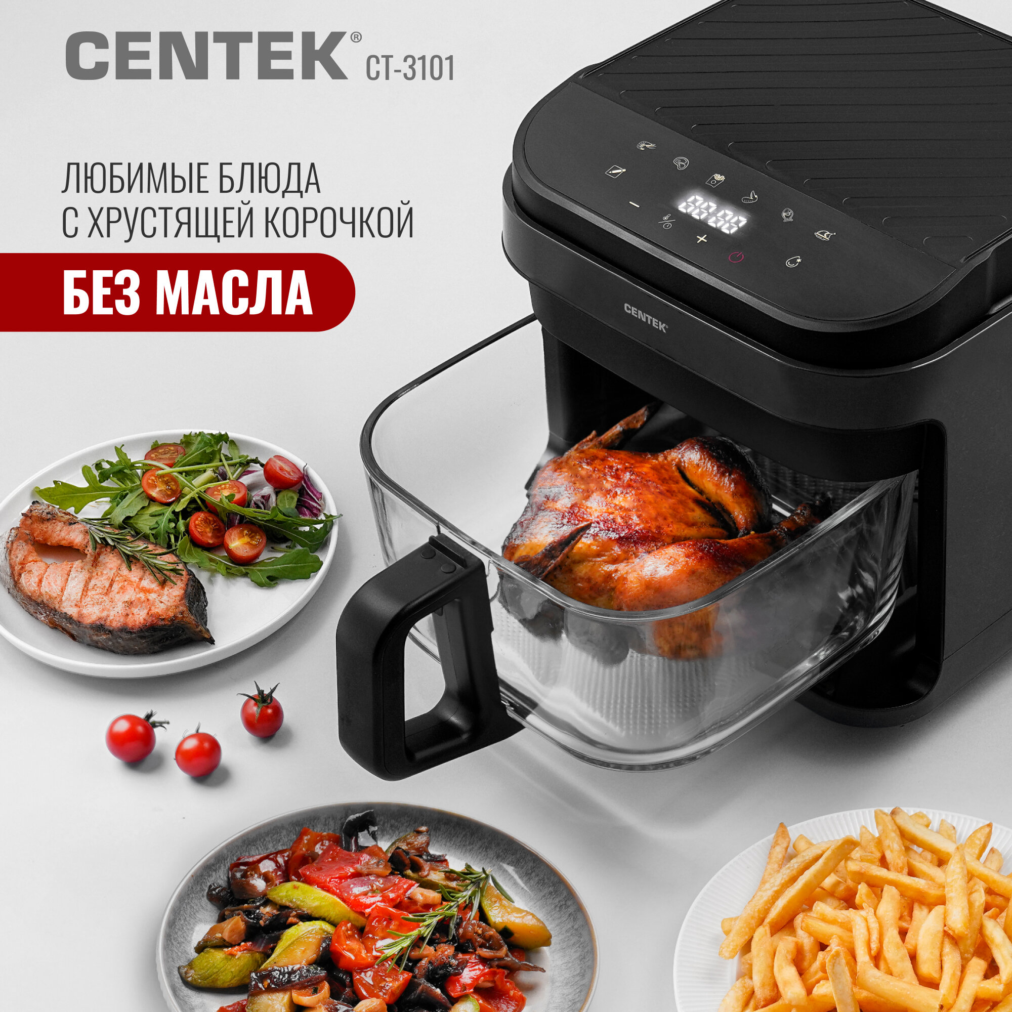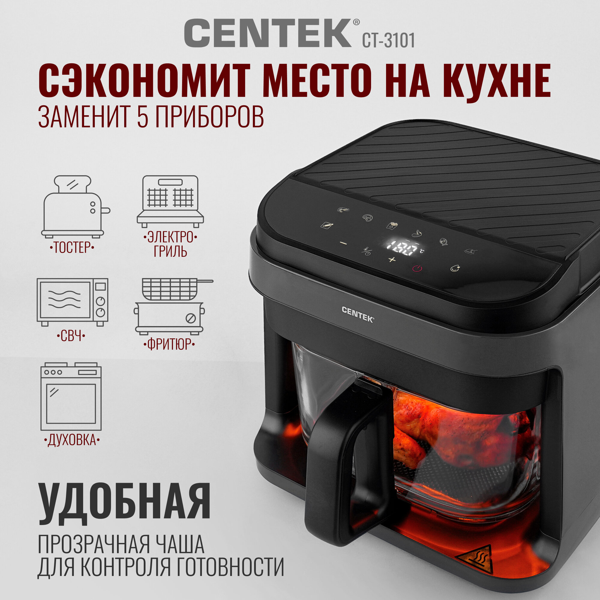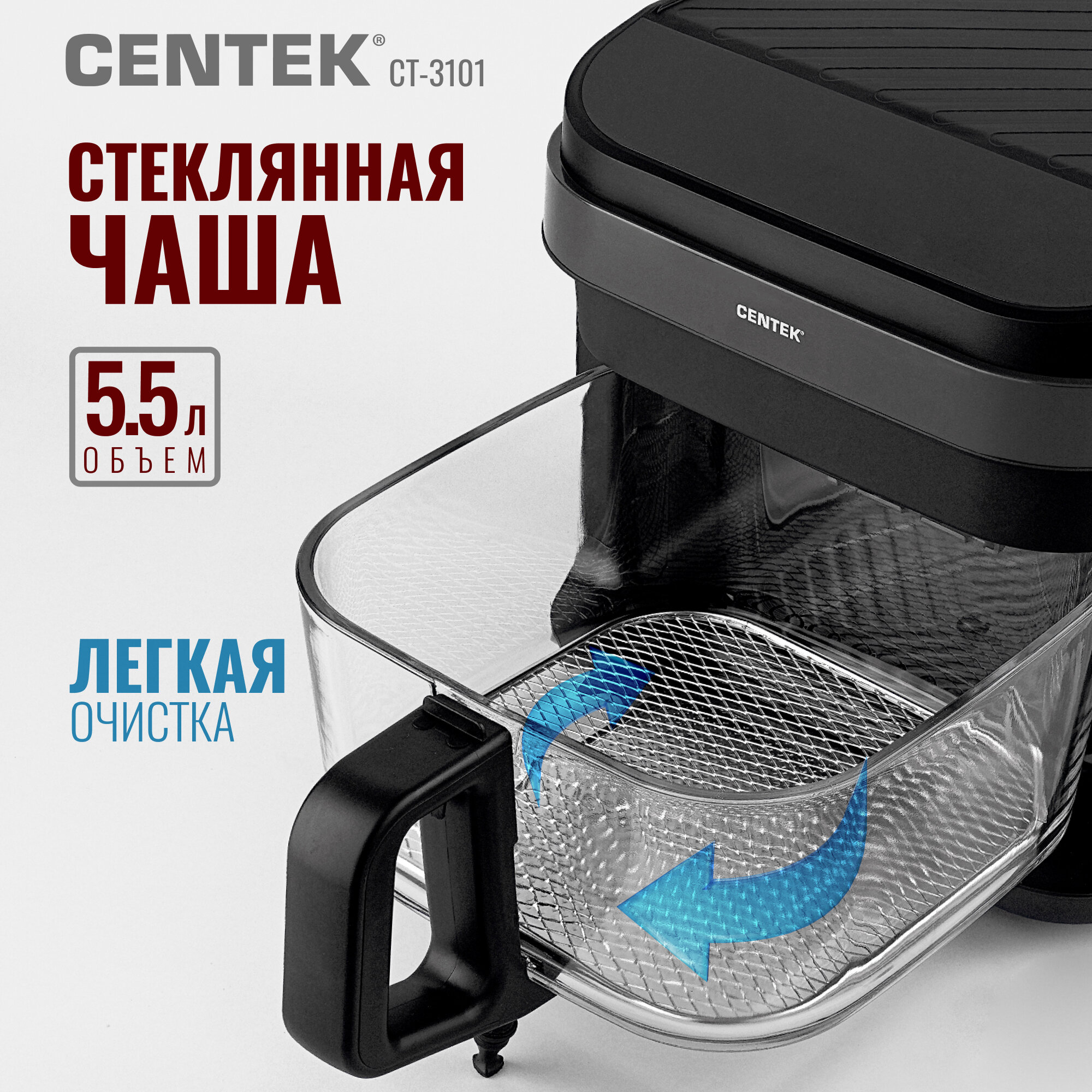 Аэрогриль Centek CT-3101: 1350Вт, сенсорное управление, 7 программ, быстрый нагрев, карбоновый тэн, со стеклянной чашей интересное: