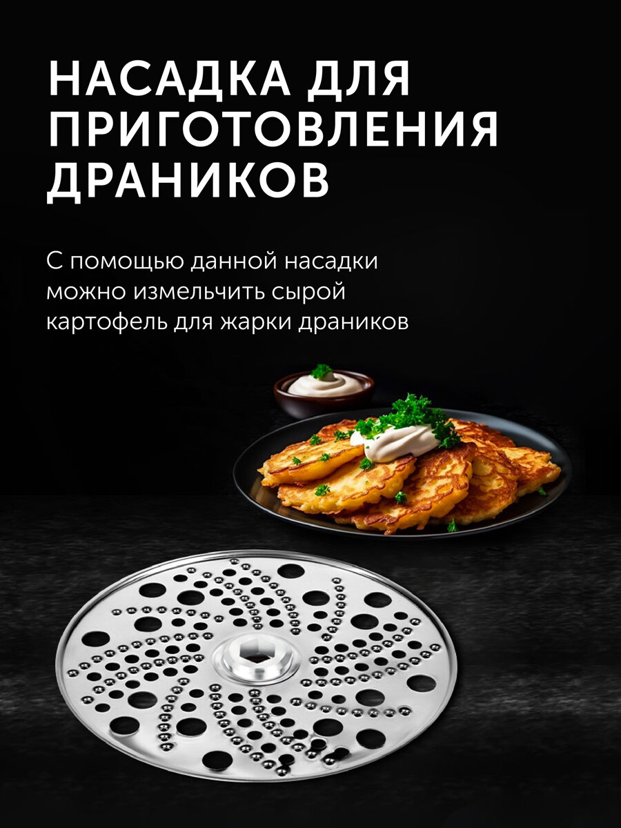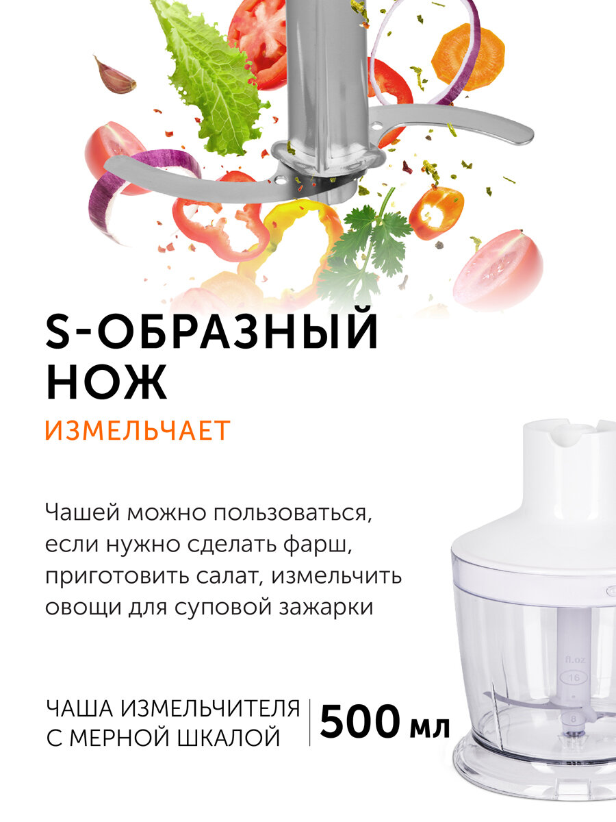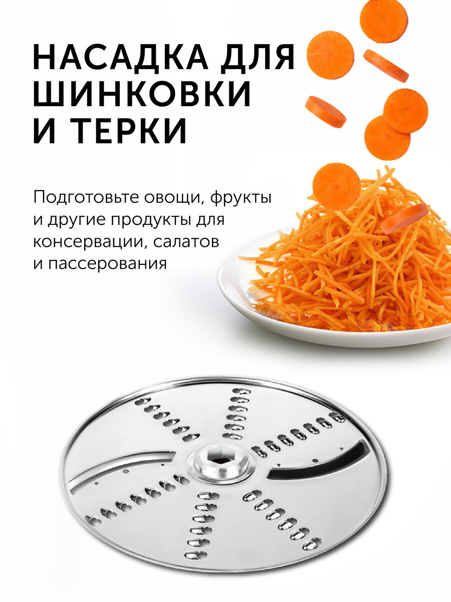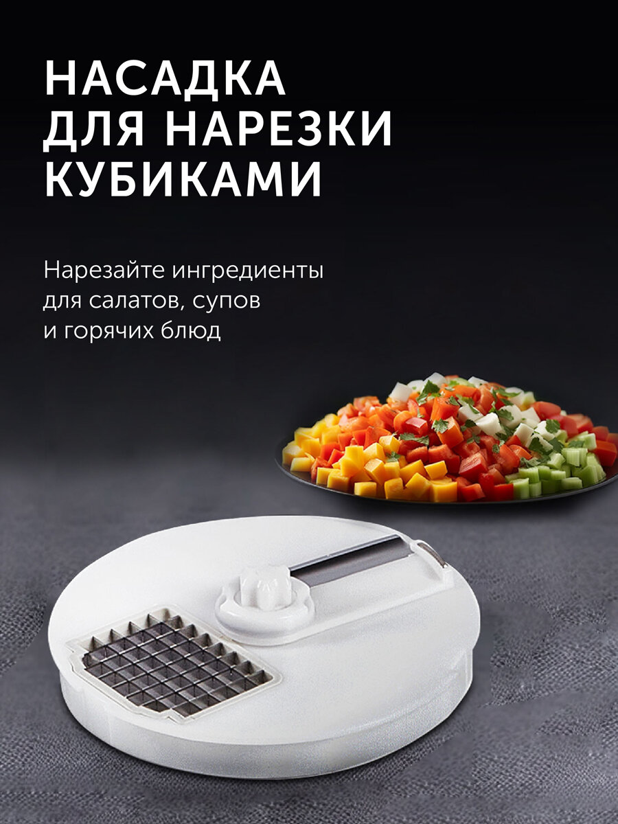 | Насадки | венчик для взбивания / для нарезки кубиками / измельчитель / терка |