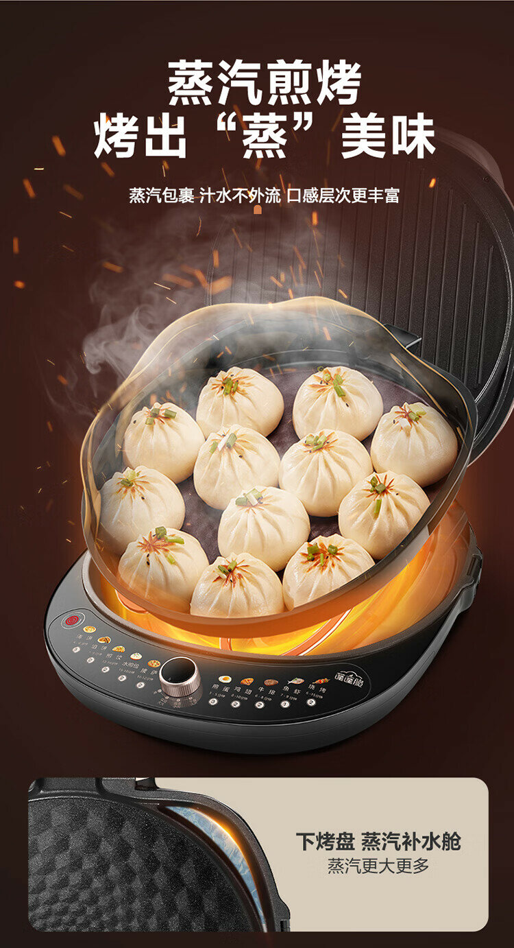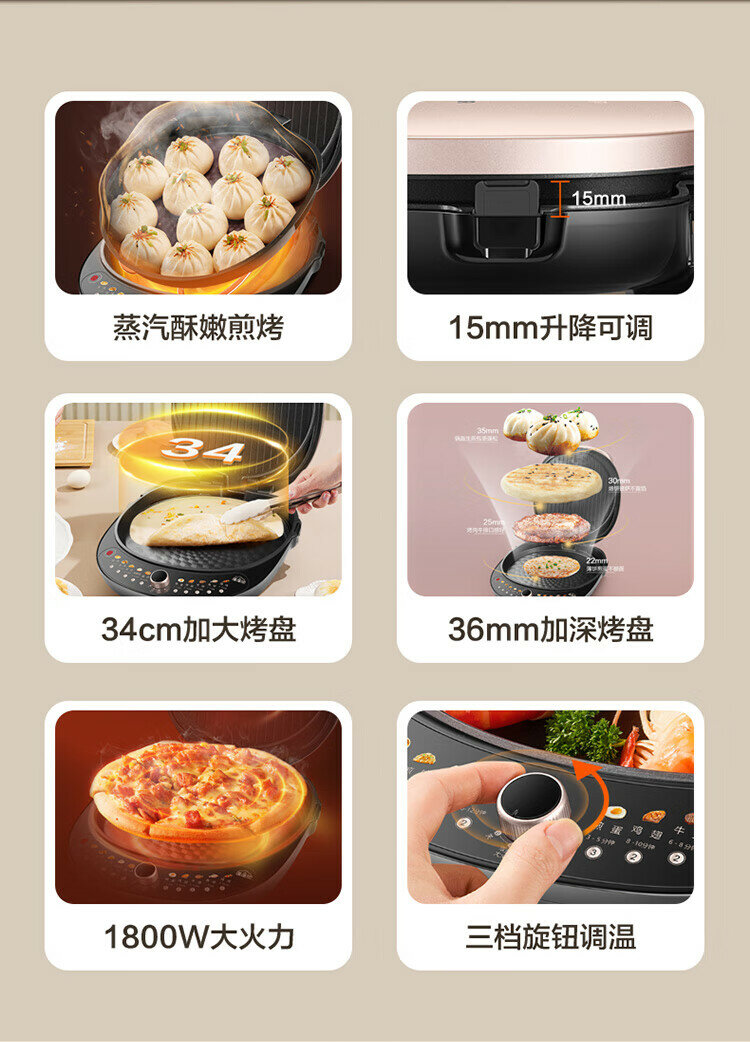 | Дополнительная информация | паровая пластина, 2-скоростной подъем, большая форма для выпечки 34 см, углубленная форма для выпечки 36 мм, регулировка температуры ручкой, трехскоростная регулировка огня, высокая мощность 1800 Вт, быстрая жарка и гриль, жарка и гриль на пару |