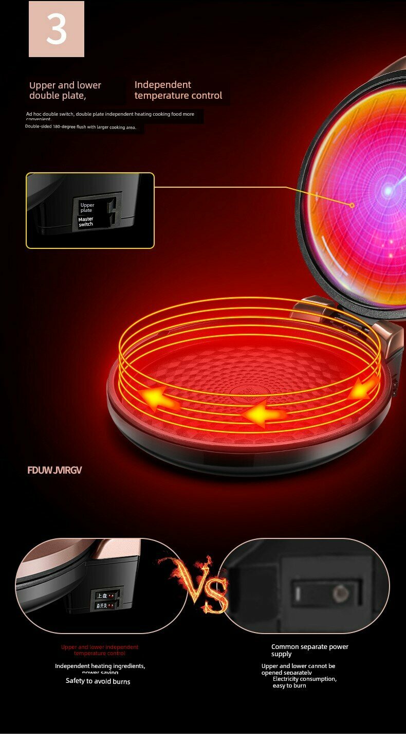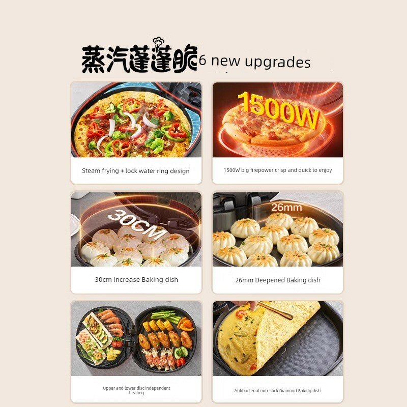 | Дополнительная информация | двусторонний нагрев, подвесная конструкция, увеличение жарочной поверхности на 30 см, углубленная жарочная поверхность на 26 мм, независимость верхней и нижней дисков, антибактериальная антипригарная алмазная жарочная поверхность, свободное открытие и закрытие на 180 градусов, независимый контроль температуры при двусторонней жарке, двусторонний нагрев верхней и нижней жарочных поверхностей, жарочная поверхность с зернистой структурой, конструкция водяного кольца для удержания питательных веществ, большая огневая мощь 1500 Вт, возможность независимого нагрева верхней и нижней дисков, функция парового гриля |