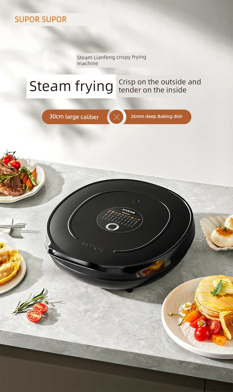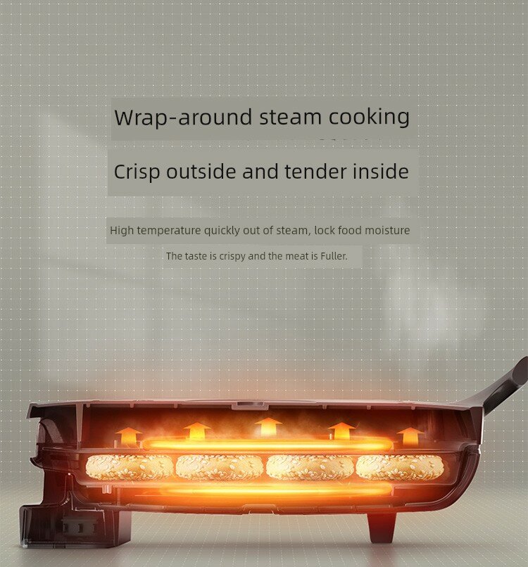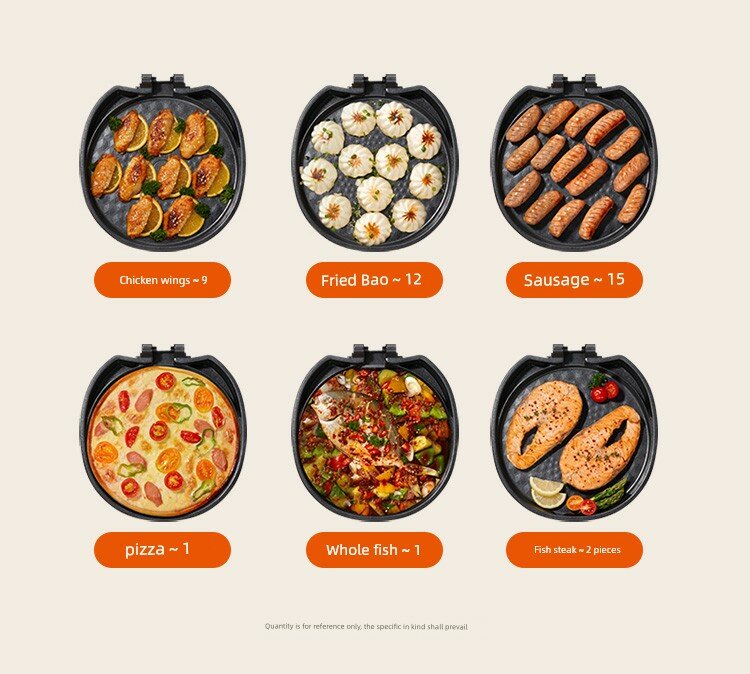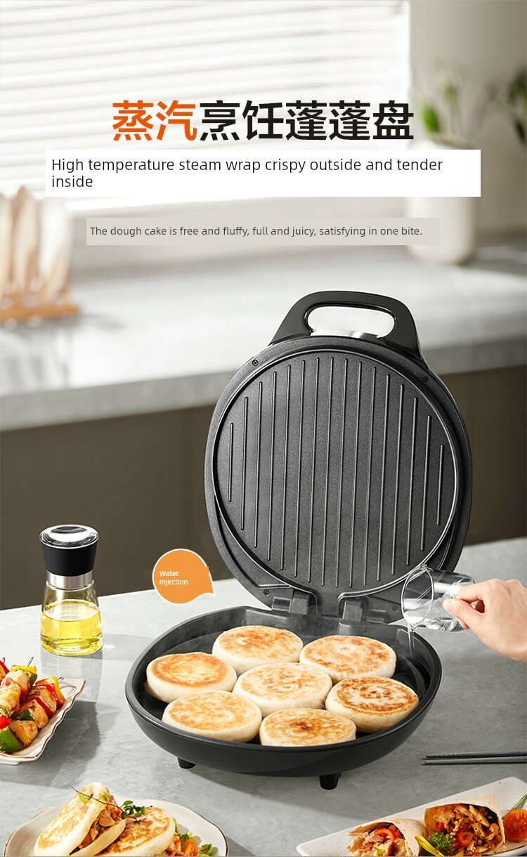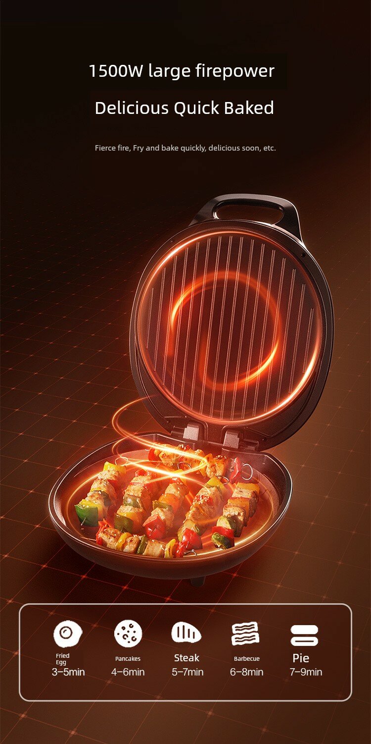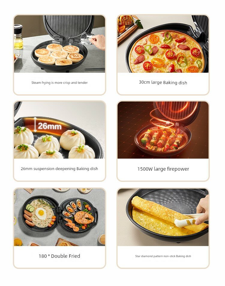 | Дополнительная информация | двусторонний нагрев, большая огневая мощь 1500 Вт, верхний и нижний диски могут нагреваться независимо, большая форма для выпечки 30 см, форма для выпечки глубиной 26 мм, форма для выпечки с антипригарным покрытием в виде звездного бриллианта, антибактериальный эффект 99,9%, жарка на двух сковородах 180°, приготовление на пару, регулируемый пятиступенчатый гражданский и военный огонь, несъемный плавитель, регулируемая форма для выпечки, выпечка торта, жарка, брендирование |