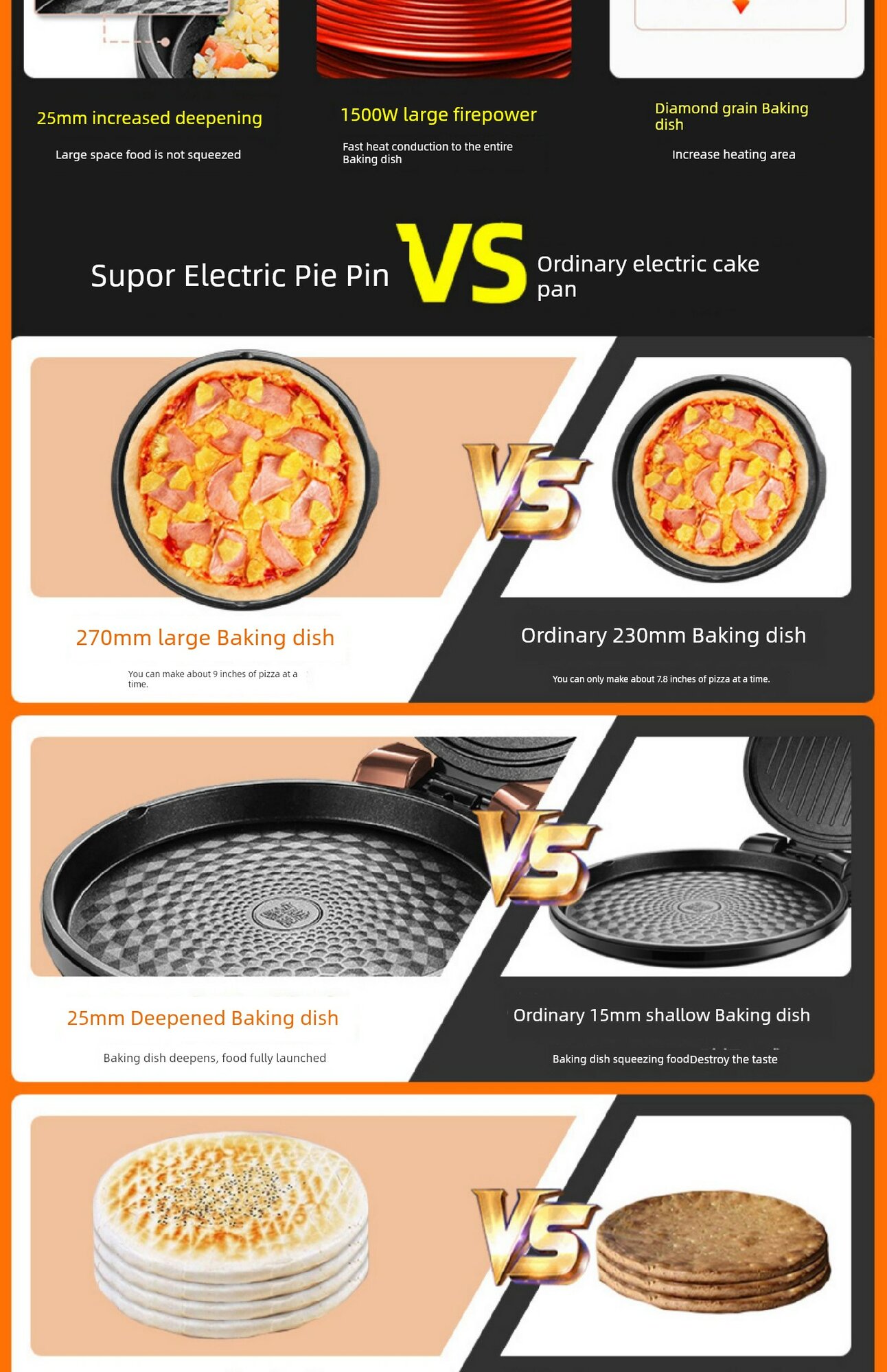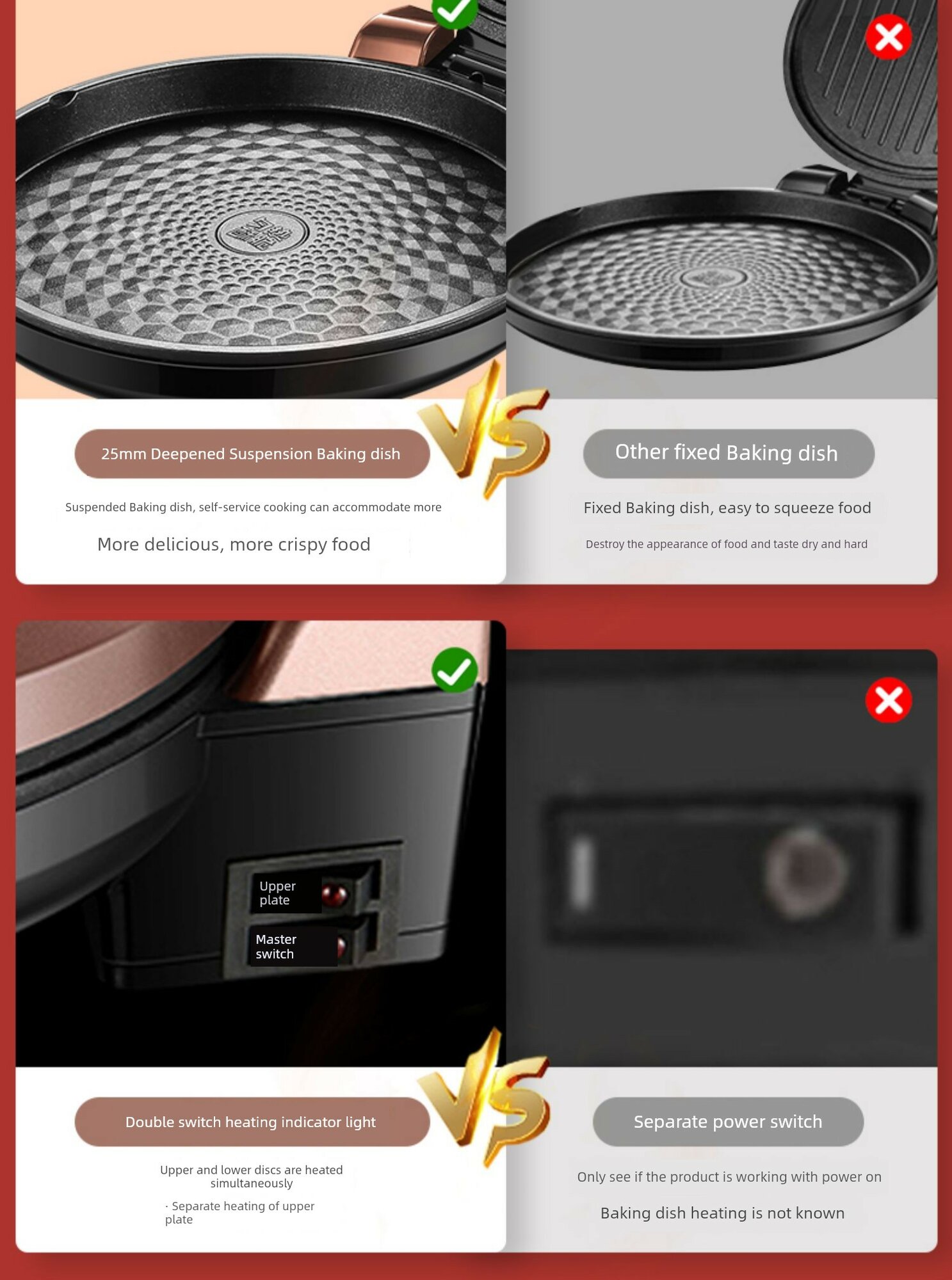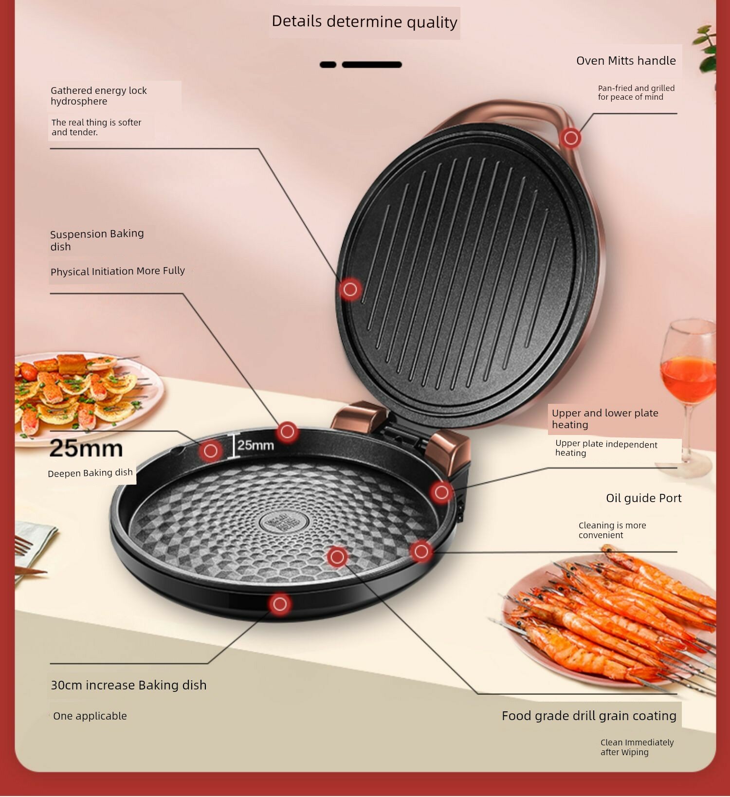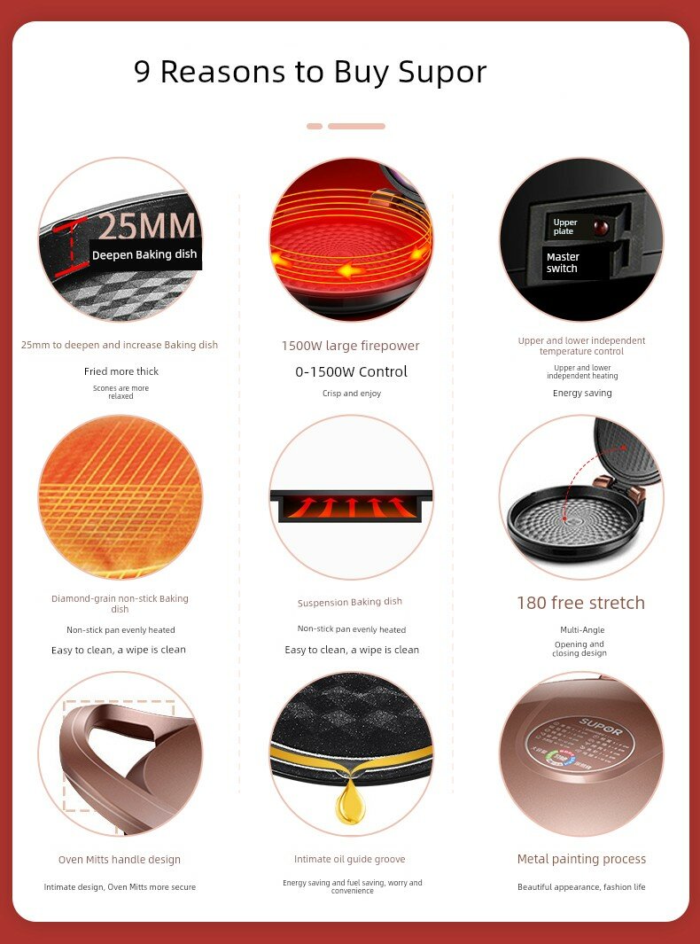 | Дополнительная информация | двусторонний нагрев, большая огневая мощь 1500 Вт, верхняя и нижняя пластины могут нагреваться независимо, большое открытие и закрытие на 180°, углубленная форма для выпечки 25 мм, подвесная форма для выпечки, многоугольная антипригарная форма для выпечки, конструкция открытия и закрытия, ручка-прихватка, металлический дизайн, процесс маслоотводного порта, двусторонний нагрев верхней и нижней формы для выпечки, независимый контроль температуры верхней и нижней формы для выпечки, антипригарная форма для выпечки с зернистой структурой, антипригарное покрытие пищевого класса, энергосбережение, углубленный маслоотводный желоб, процесс металлической покраски, кольцо для удержания питательных веществ, форма для выпечки с алмазной зернистостью |