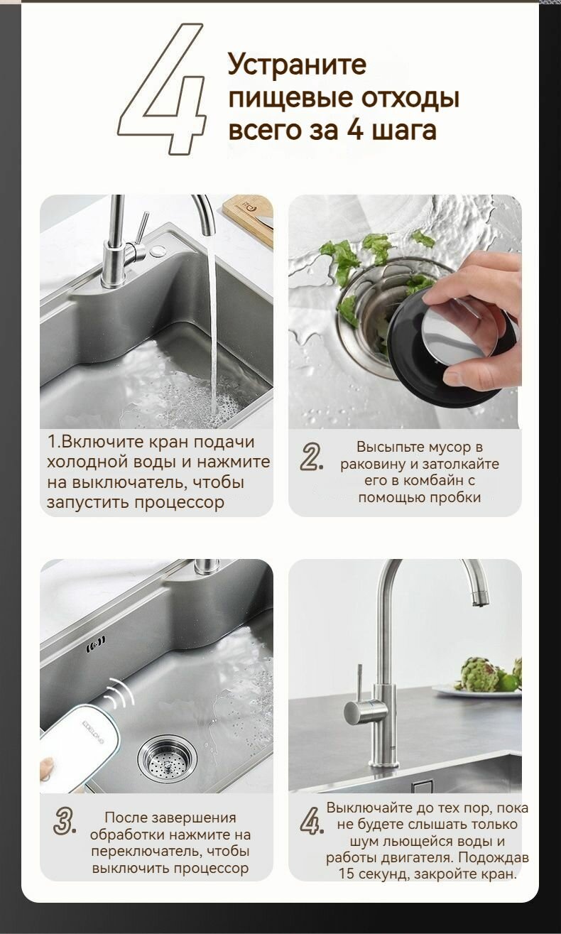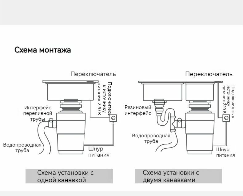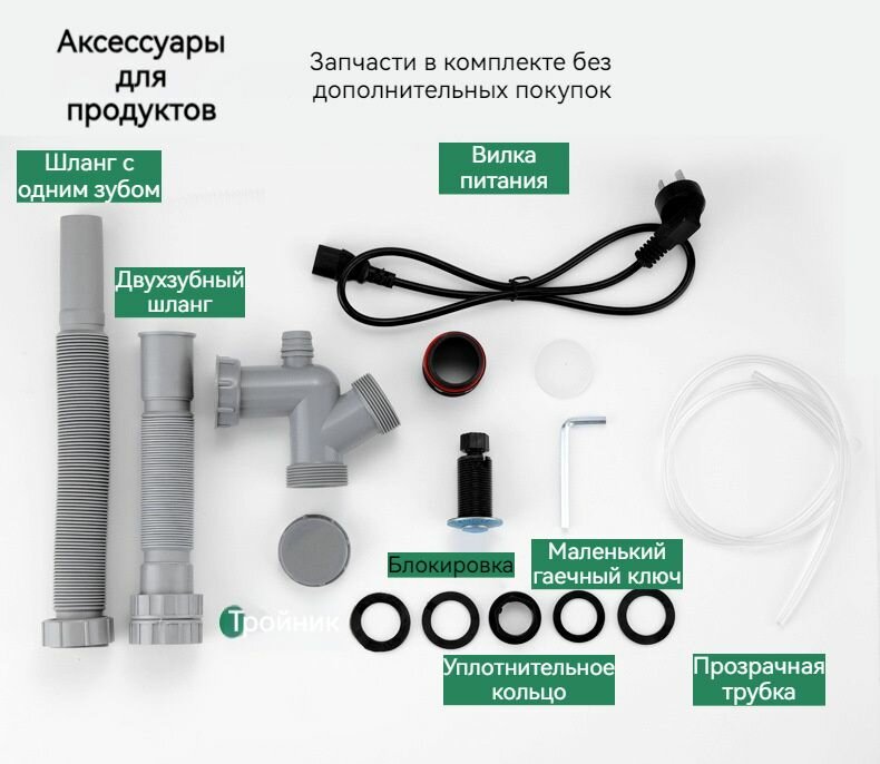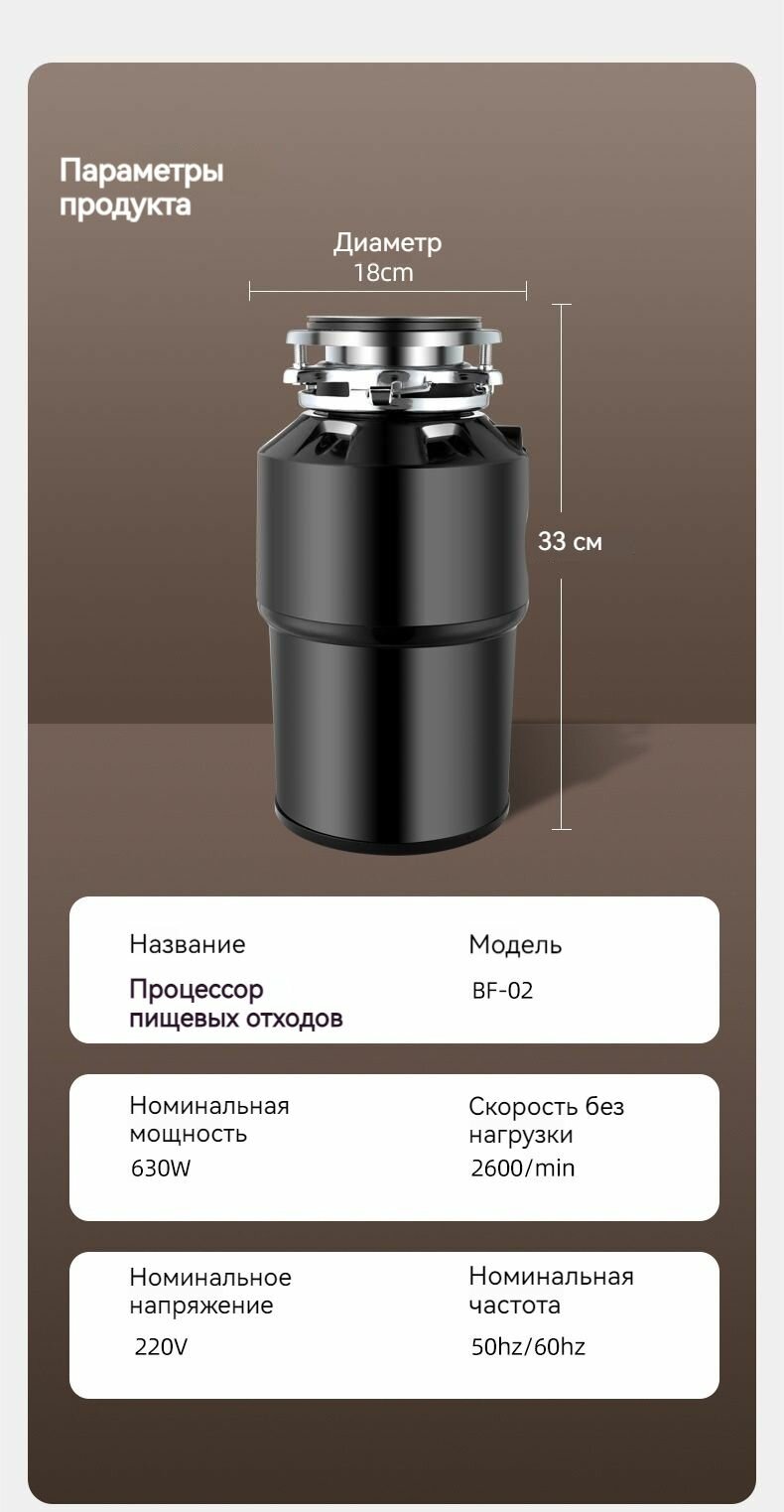| Комплектация | измельчитель кухонный электрический в раковину*1;Шланг с одним зубом*1;Двухзубный шланг*1;Вилка питания*1;Блокировка*1;Маленький гаечный ключ*1;Уплотнительное кольцо*5;Прозрачная трубка*1 |