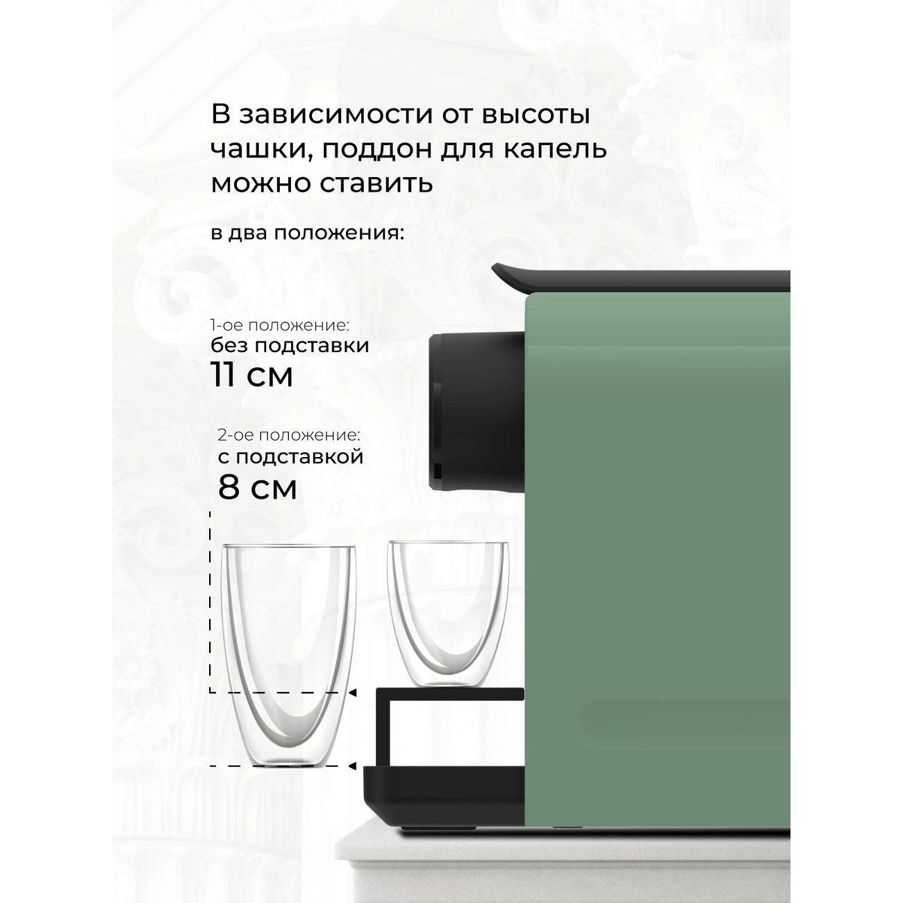 | Дополнительная информация | Регулируемая по высоте подставка для чашек; Съемный резервуар для воды; В комплекте: съемный лоток для сбора капель, съемный лоток для использованного кофе |