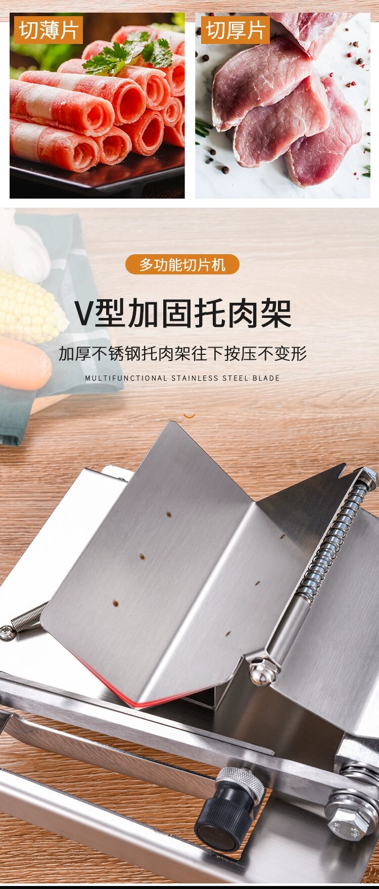 | Дополнительная информация | толщина регулируется, лезвие из утолщенной легированной стали, может нарезать сотни фунтов мяса за раз, острый и износостойкий, двойной подшипник давления, автоматическая подача мяса пружиной, удобная ручка, автоматическое падение мяса, подшипник давления, корпус из нержавеющей стали, прочный, моющийся весь корпус, пружинная подача мяса, высокая упругость, легкая подача мяса, пружинный замок цепи, гибкий замок мяса, v-образный усиленный держатель мяса, удобный захват |