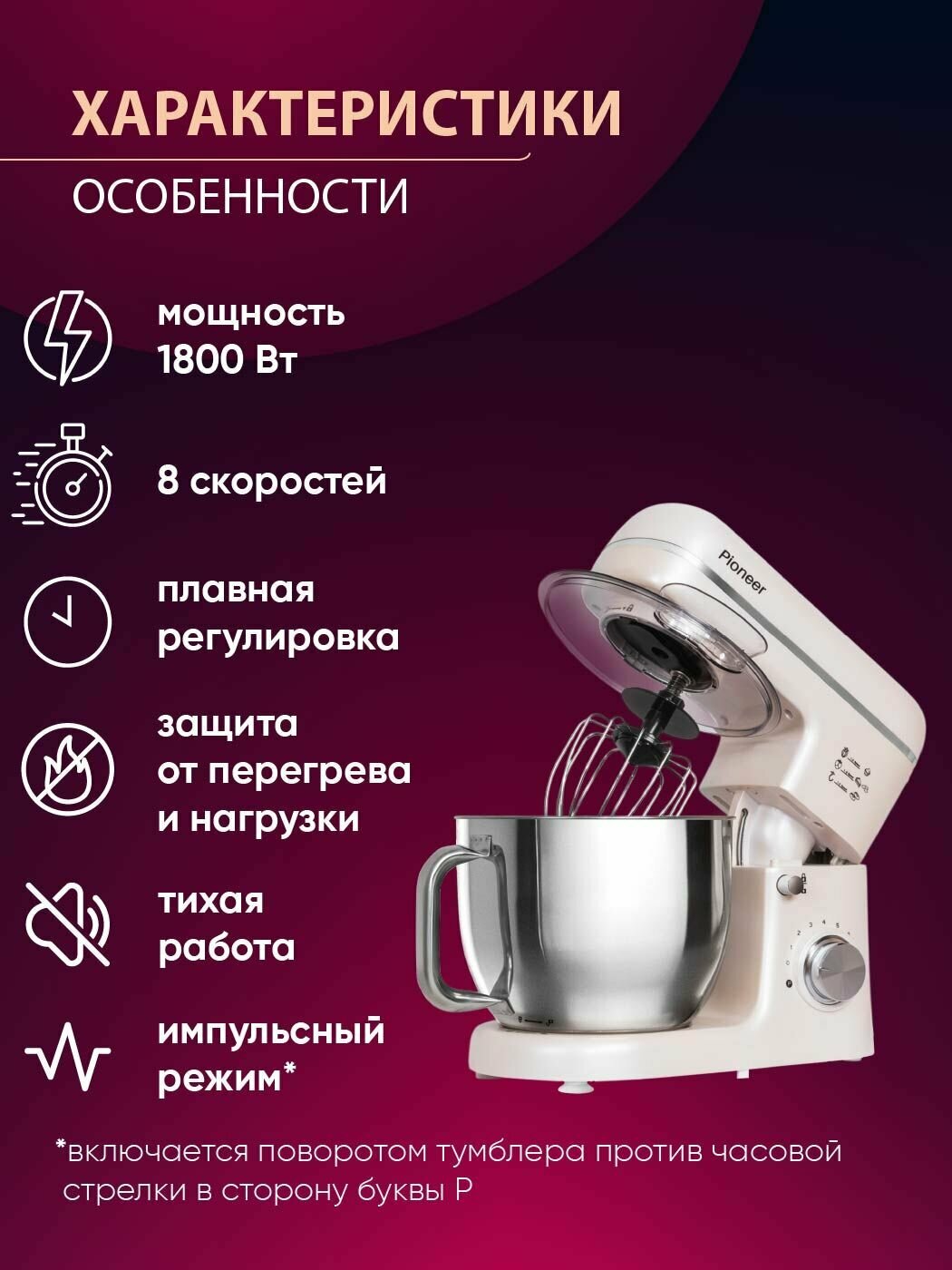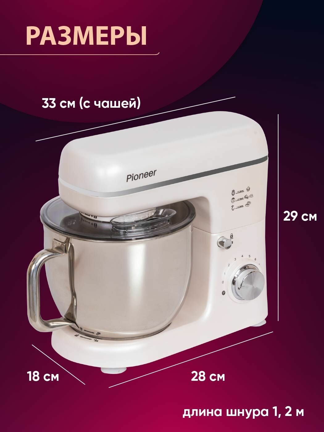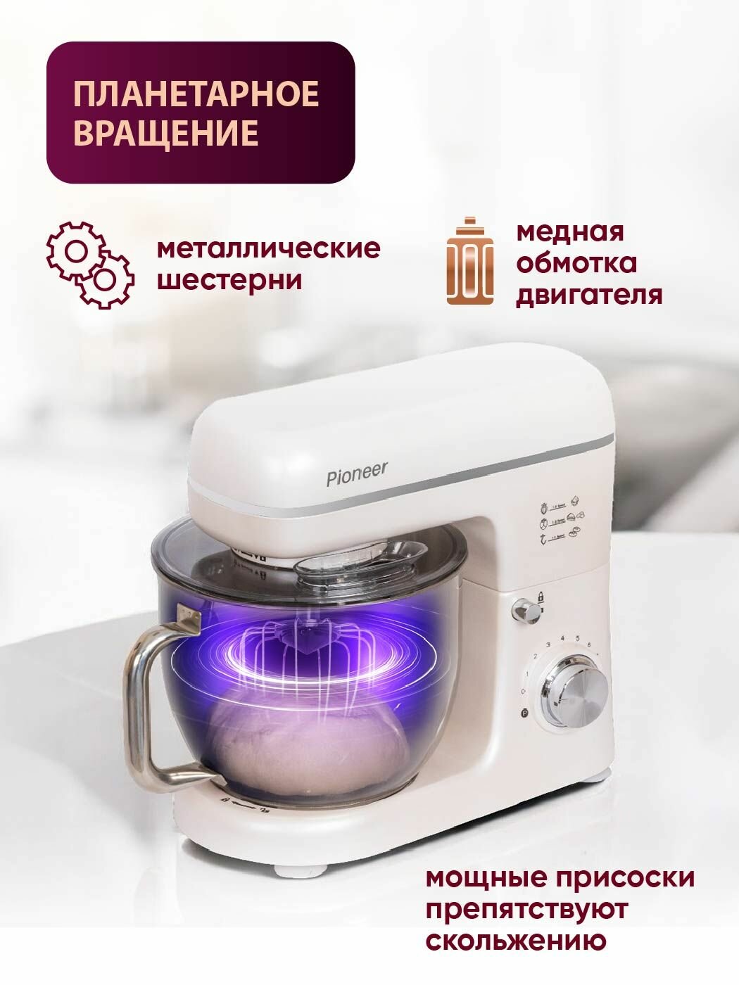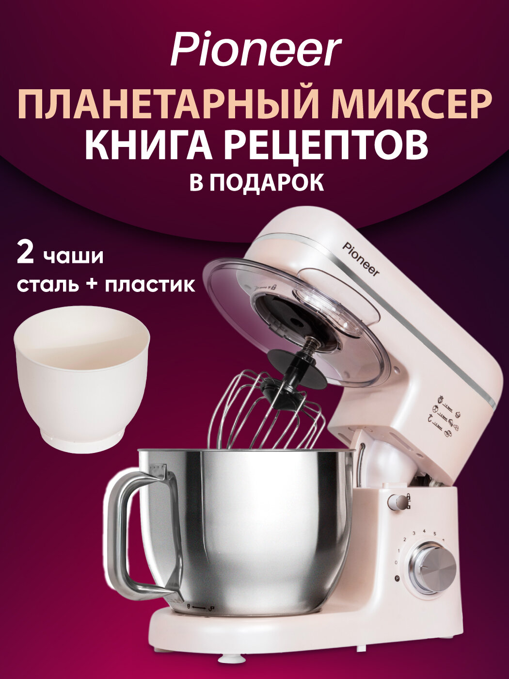 Миксер планетарный 5,5л +4,5л Pioneer с 2 чашами,1800 Вт, металлические шестерни, 8 скоростей, книга рецептов, MX370 интересное: