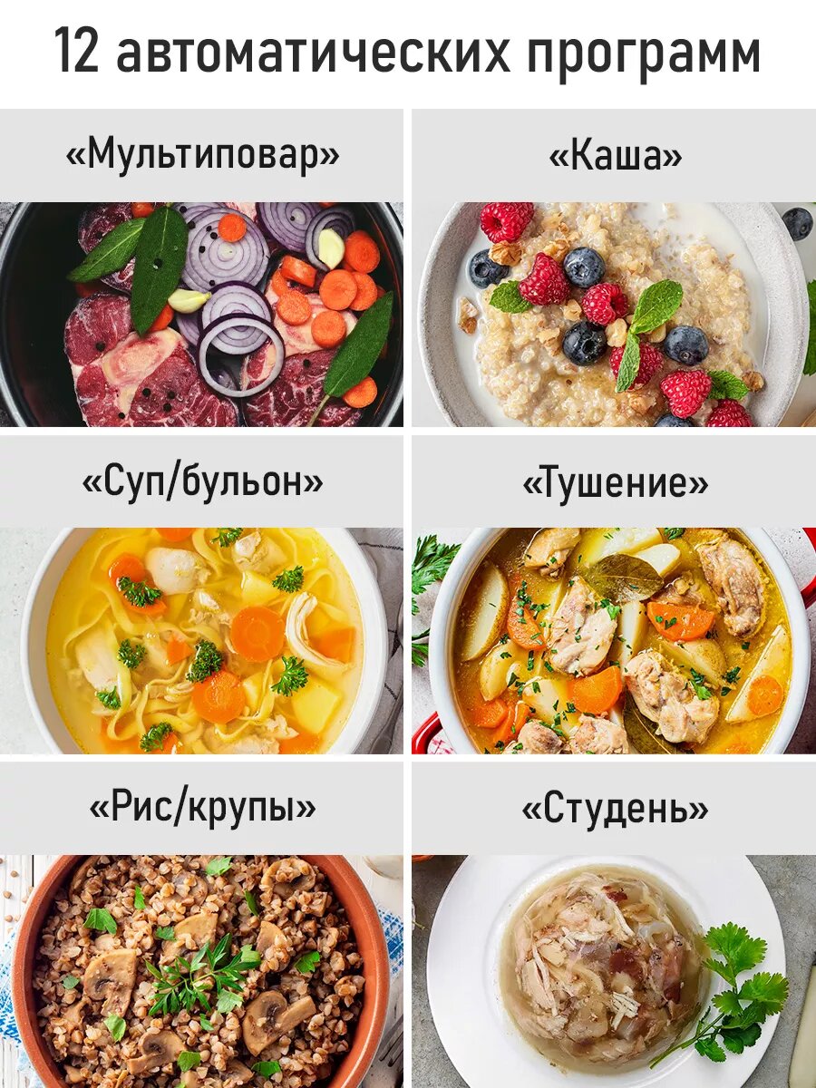 | Программы | молочная каша, мультиповар, плов, приготовление на пару, тушение |