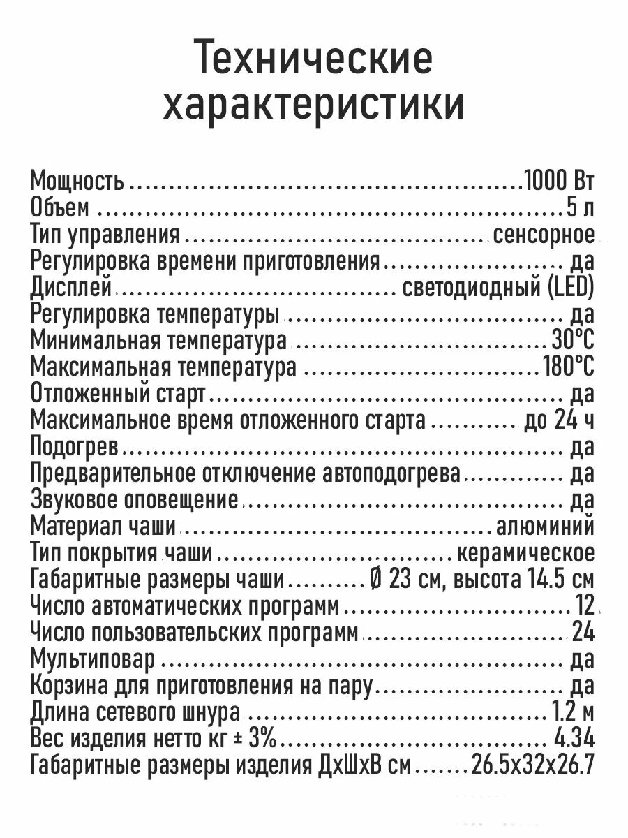 | Объём чаши | 5 л |