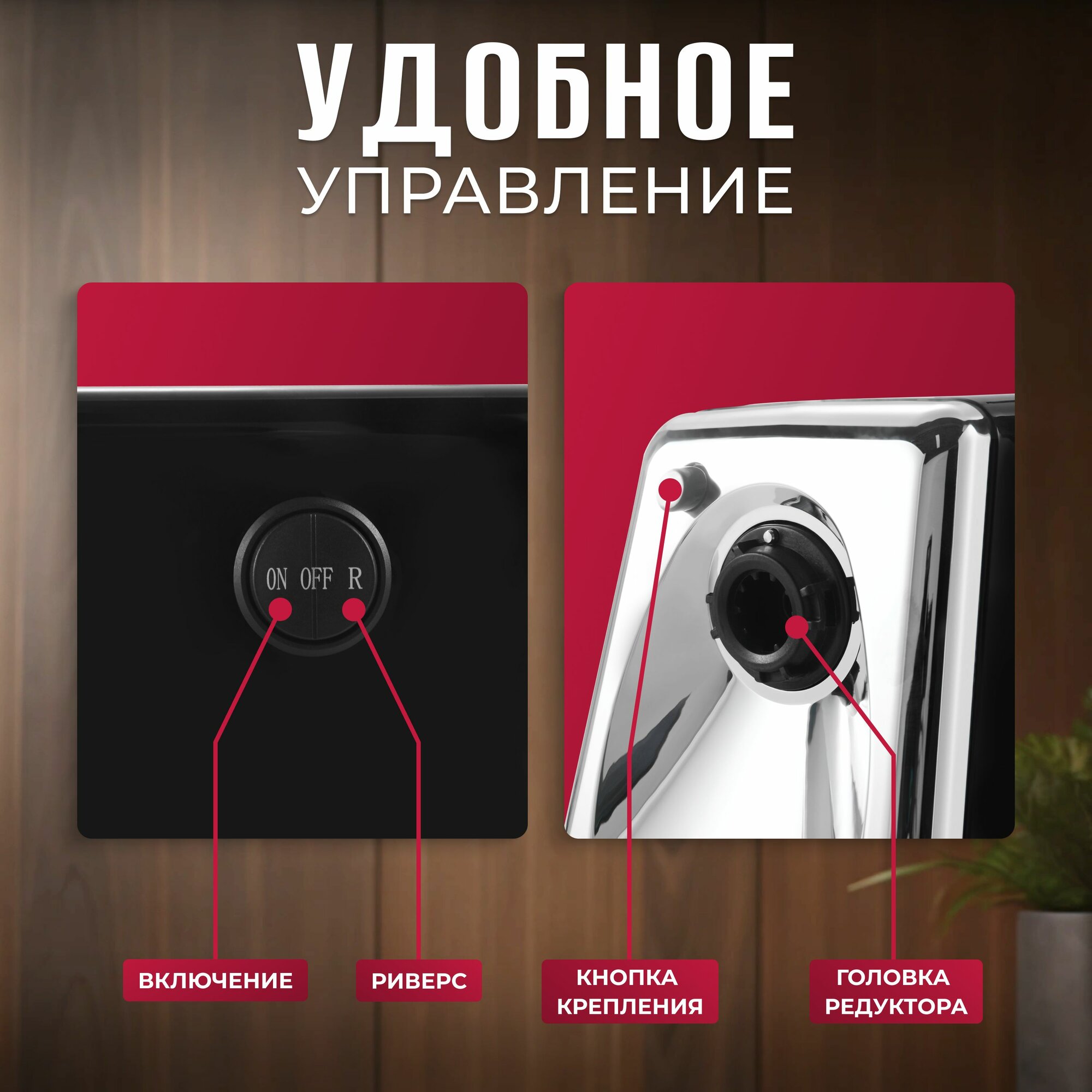 | Насадки | диск для фарша / насадка для кеббе / насадка для приготовления колбас / насадка для шинковки / Ломтерезка / Мясорубка |