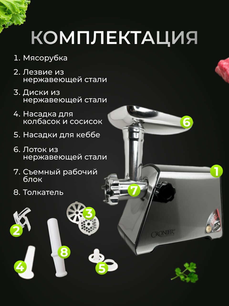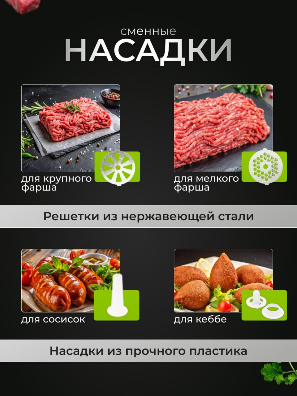 | Насадки | диск для фарша / насадка для кеббе / насадка для приготовления колбас / для крупного фарша / для мелкого фарша |