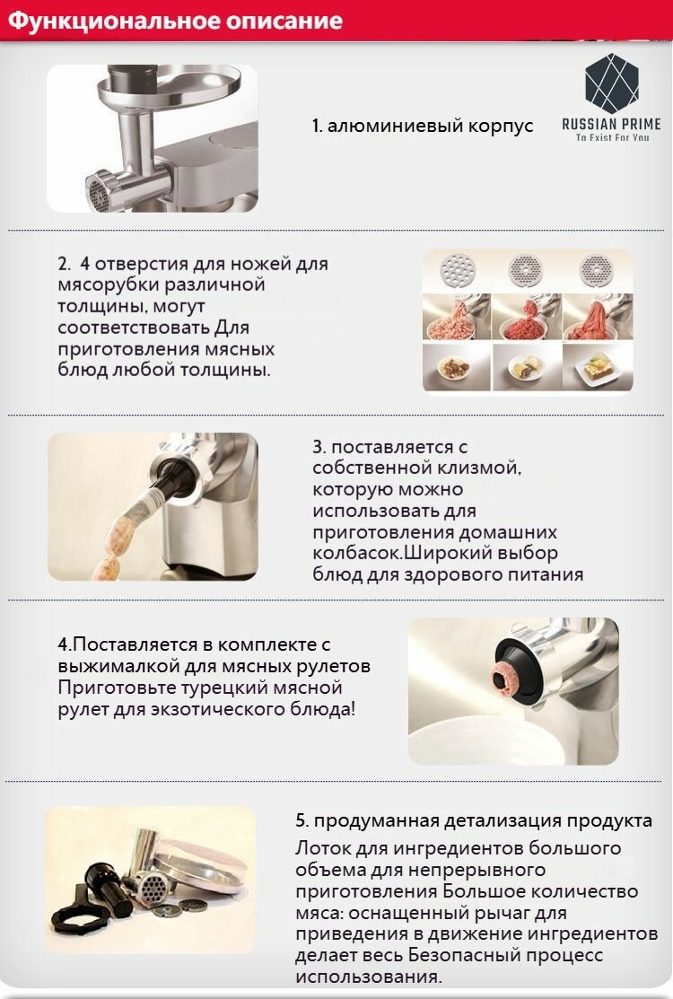 | Насадки | диск для фарша / насадка для приготовления колбас / Для пюре / Насадка-миксер |