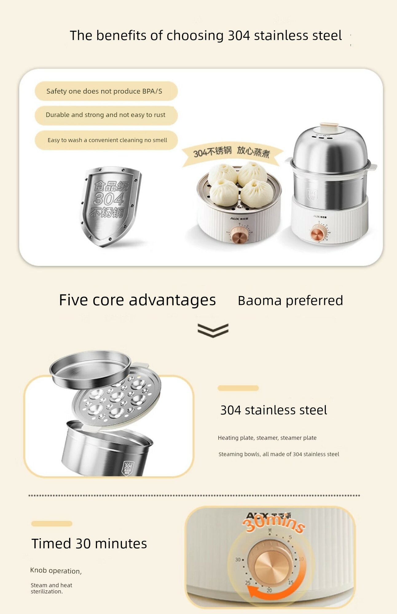 Пароварка для детского питания с таймером, нержавеющая сталь 304, двойной слой + углубленное шасси + пароварочная чаша 304