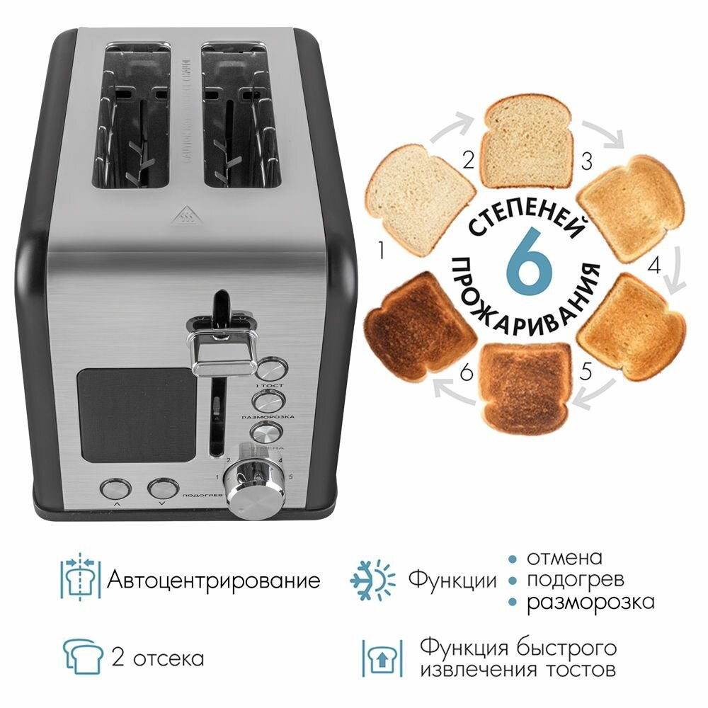 | Дополнительная информация | Тип управления: механический, 6 степеней поджаривания, Функция автоматического центрирования тостов, Термоизолированный корпус, Функции разморозки, Функция подогрева, Функция отмены, Отсек для хранения провода питания, Функция поджарки одного тоста, Съемный поддон для крошек, Прорезиненные ножки, Автоматический выброс тостов, LCD дисплей и LED подсветка кнопок, 8 режимов поджаривания для разных видов хлеба и выпечки |