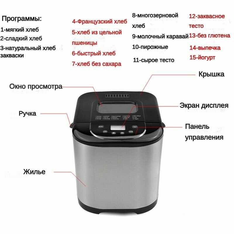 | Программы | ржаной хлеб / Безглютеновый хлеб / Брожение / Быстрый хлеб / Дрожжевое тесто / Классический хлеб / Молочный хлеб / Поддержание тепла / Хлеб для сэндвичей / Цельнозерновой хлеб |