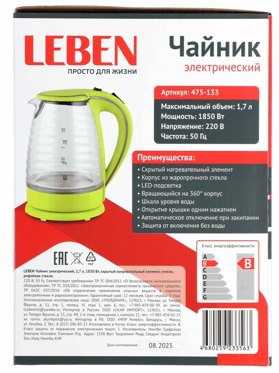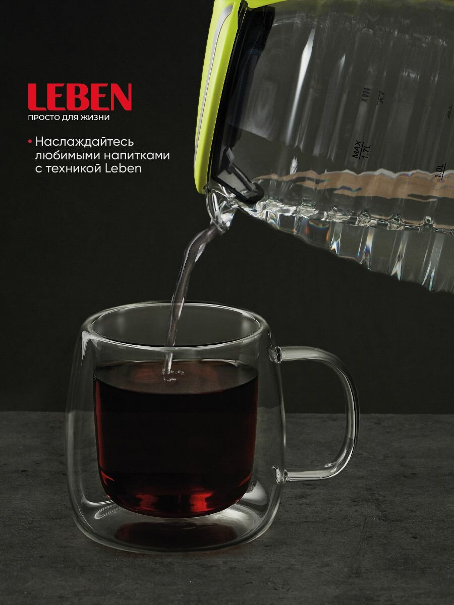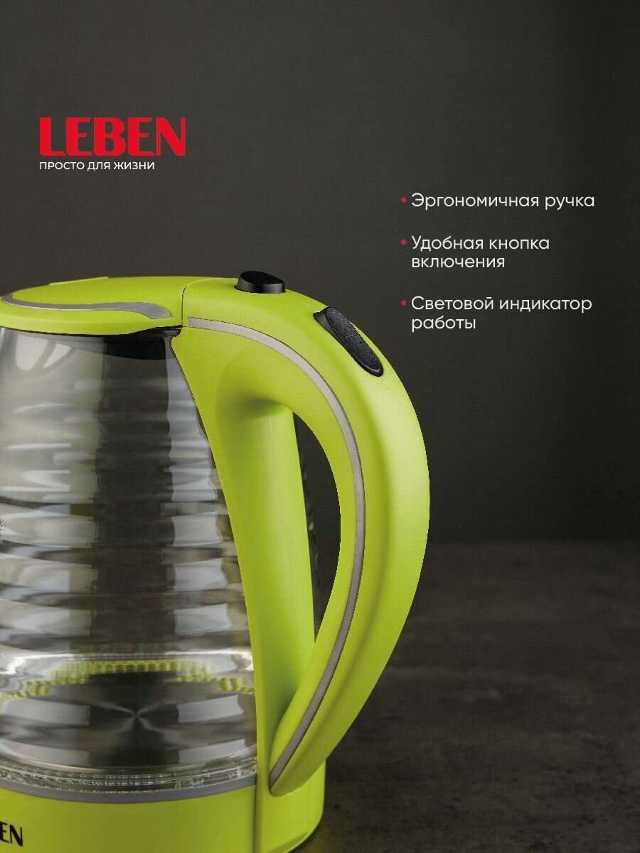 LEBEN Чайник электрический со стеклянной колбой, 1850 Вт, 1,7л