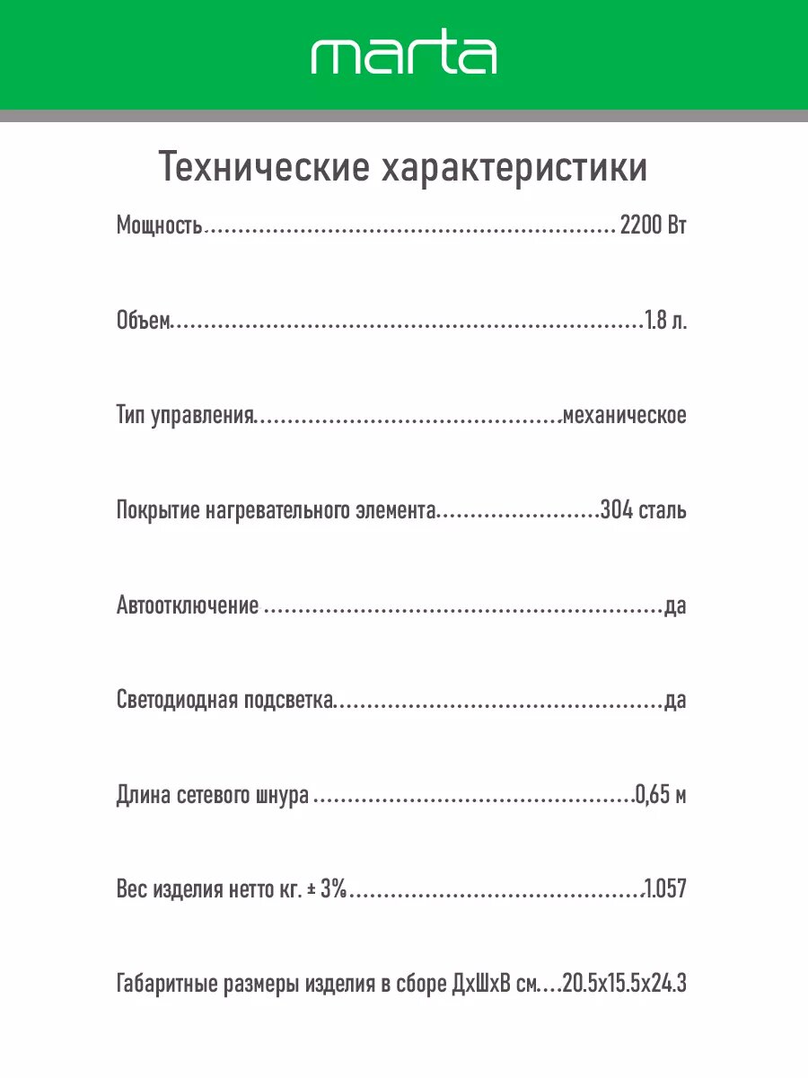Ниже Вы можете прочитать отзывы на Электрический чайник MARTA MT-4610 белый стеклянный с подсветкой, 1,8 л, ознакомится с подробными характеристиками, посмотреть интересные обзоры и фотографии на Электрический чайник MARTA MT-4610 белый стеклянный с подсветкой, 1,8 л.