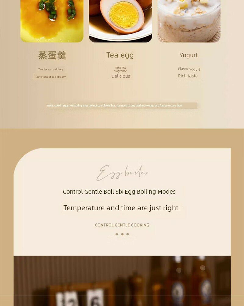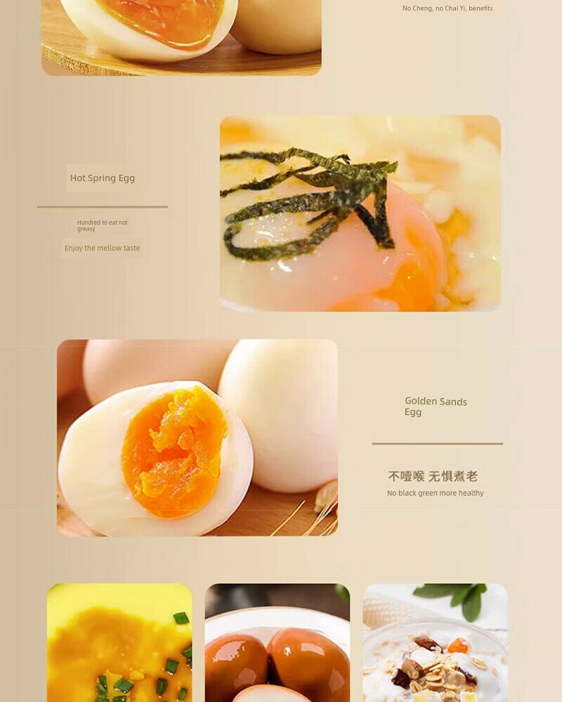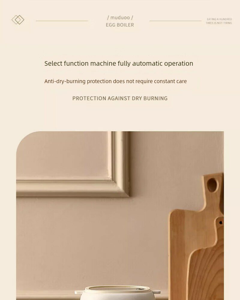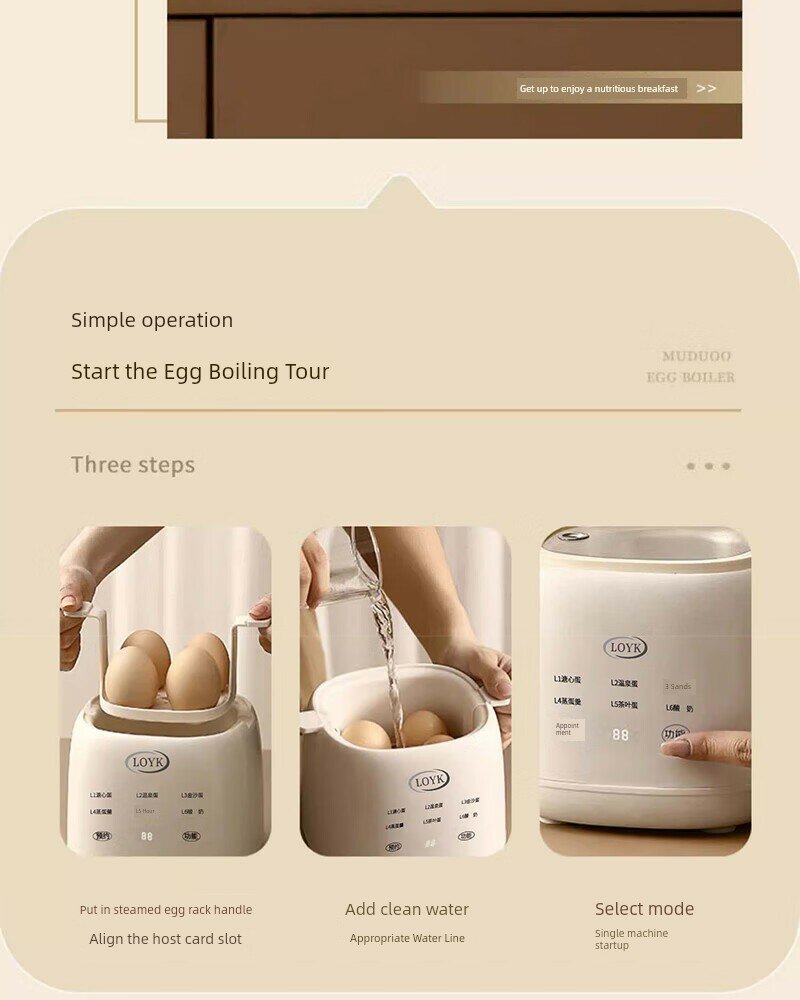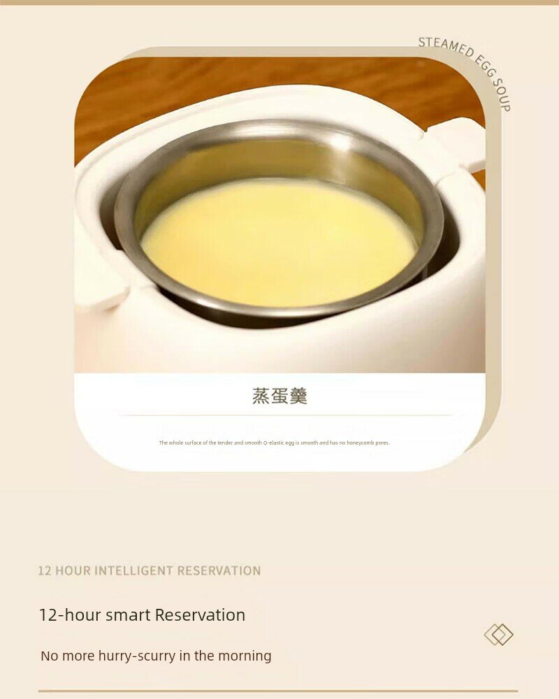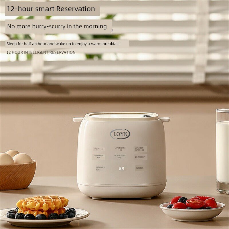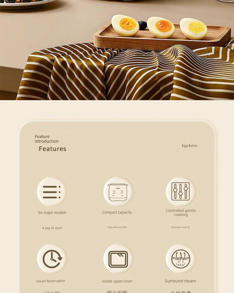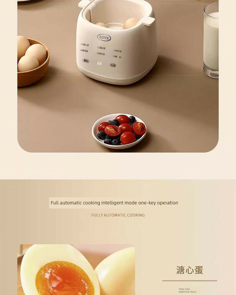 | Дополнительная информация | шесть основных режимов, видимая верхняя крышка, защита от сухого горения, 12-часовое интеллектуальное резервирование, приготовление заварного крема на пару, вареные яйца, таймер, сохранение тепла, автоматическое отключение питания, материал PP, вместимость 4 яйца, 6 режимов контроля мягкого приготовления, пищевой контактный материал, удобная очистка, защита здоровья, не нужно смотреть, протрите тряпкой, полностью автоматическое приготовление, интеллектуальный режим работы одной кнопкой, защита от высыхания. |