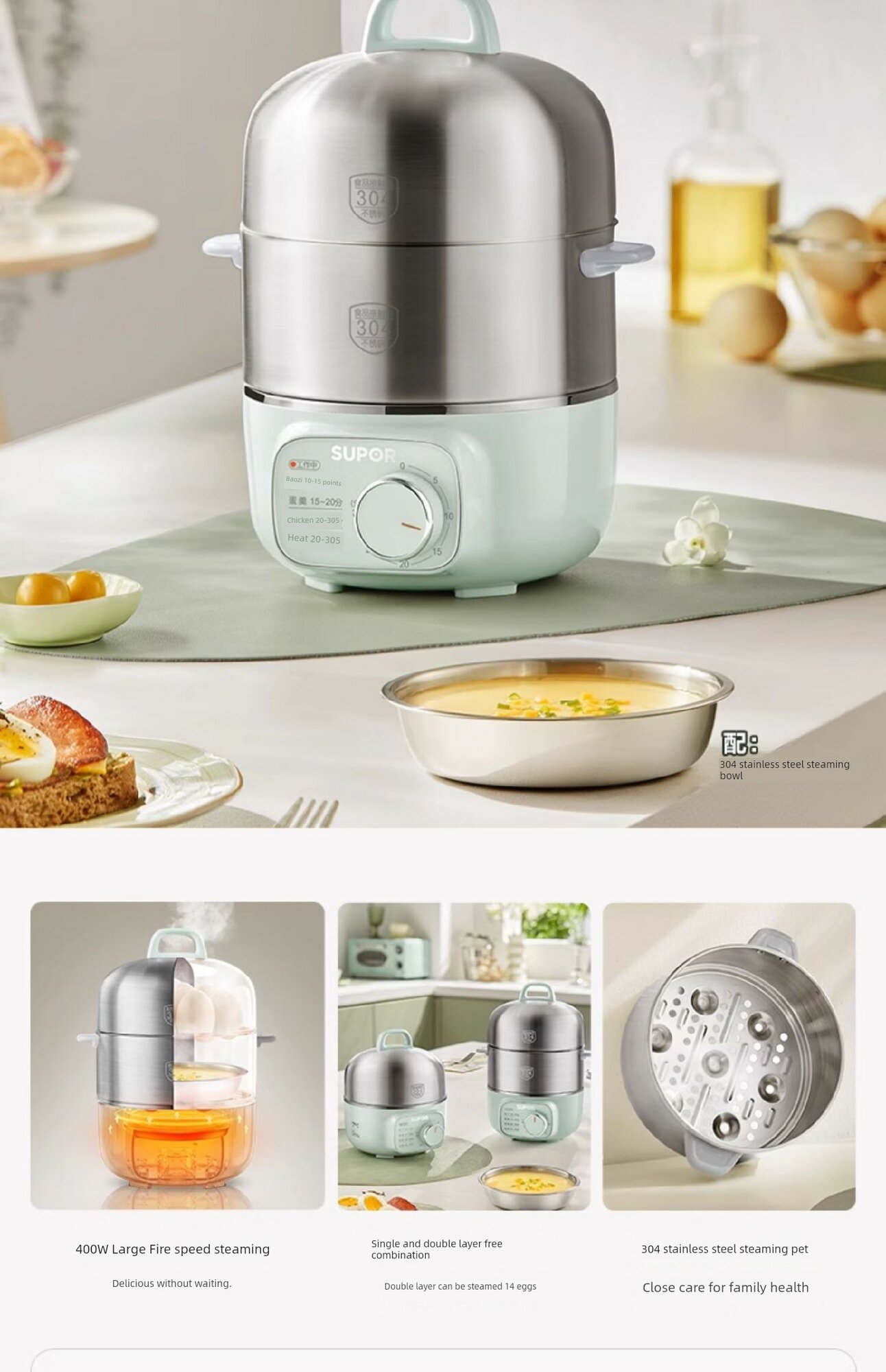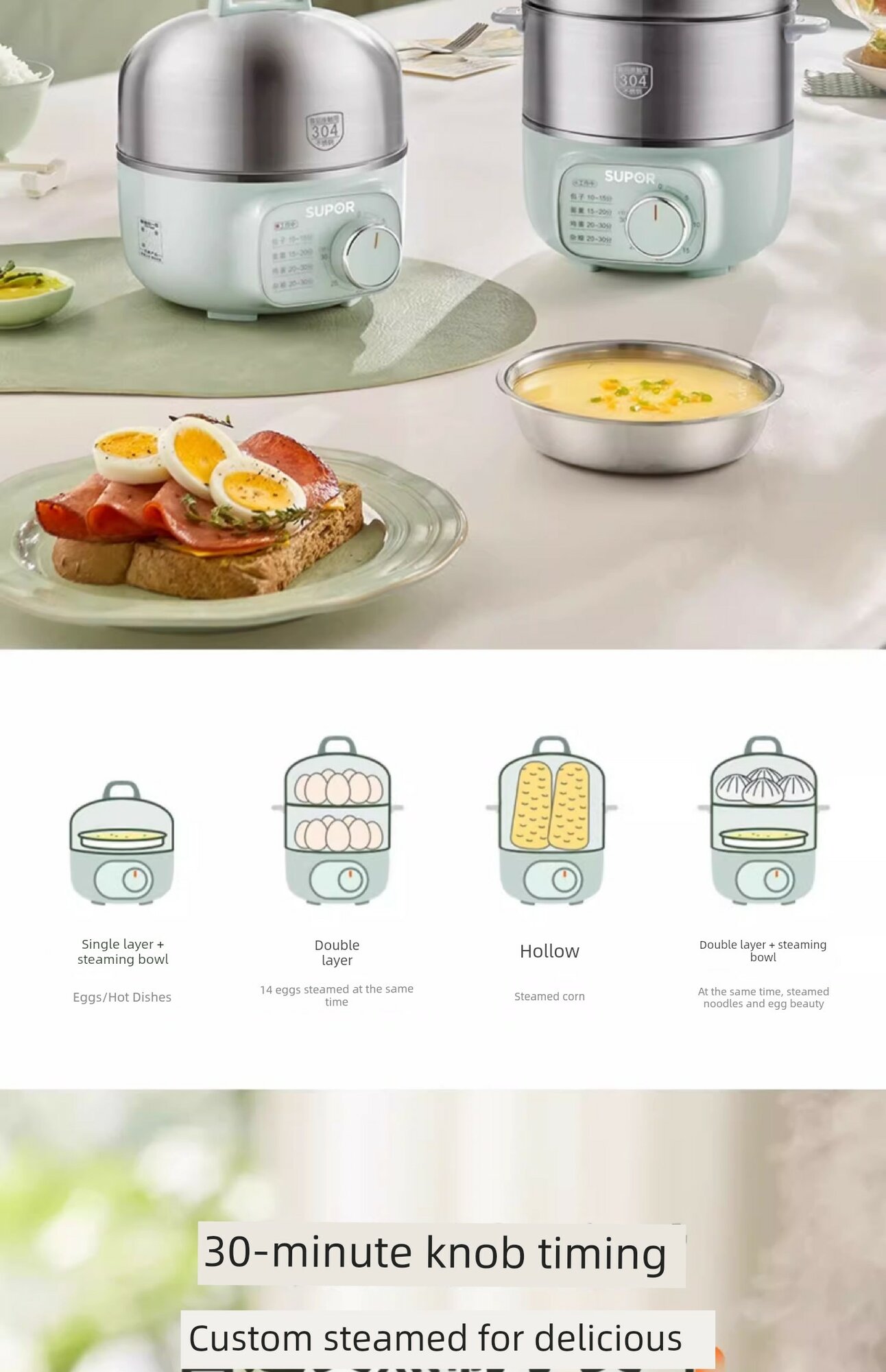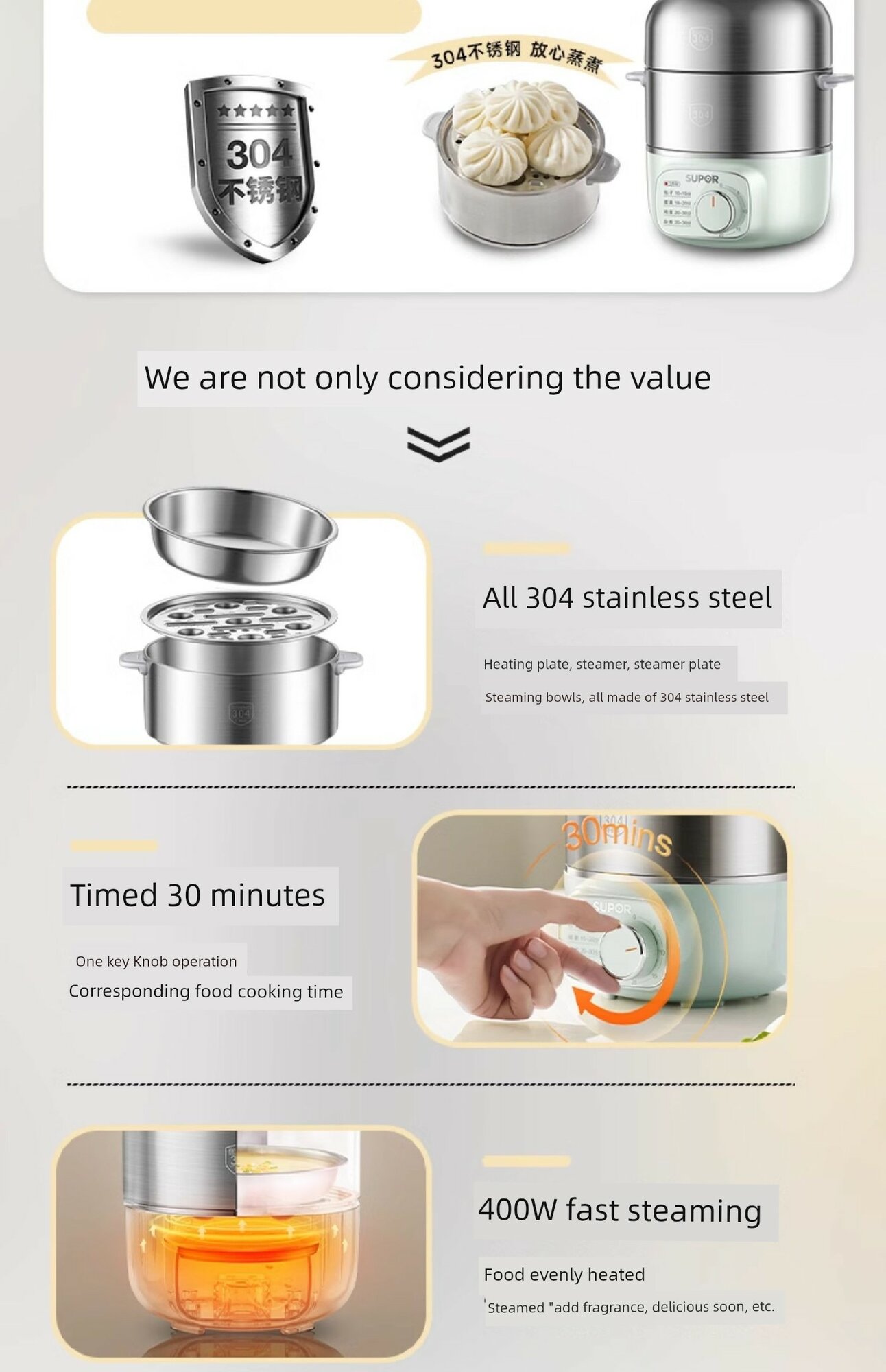 | Дополнительная информация | корпус из нержавеющей стали 304, 30-минутный таймер с ручкой, переключение между одинарным и двойным слоем, быстрое приготовление на пару мощностью 400 Вт |