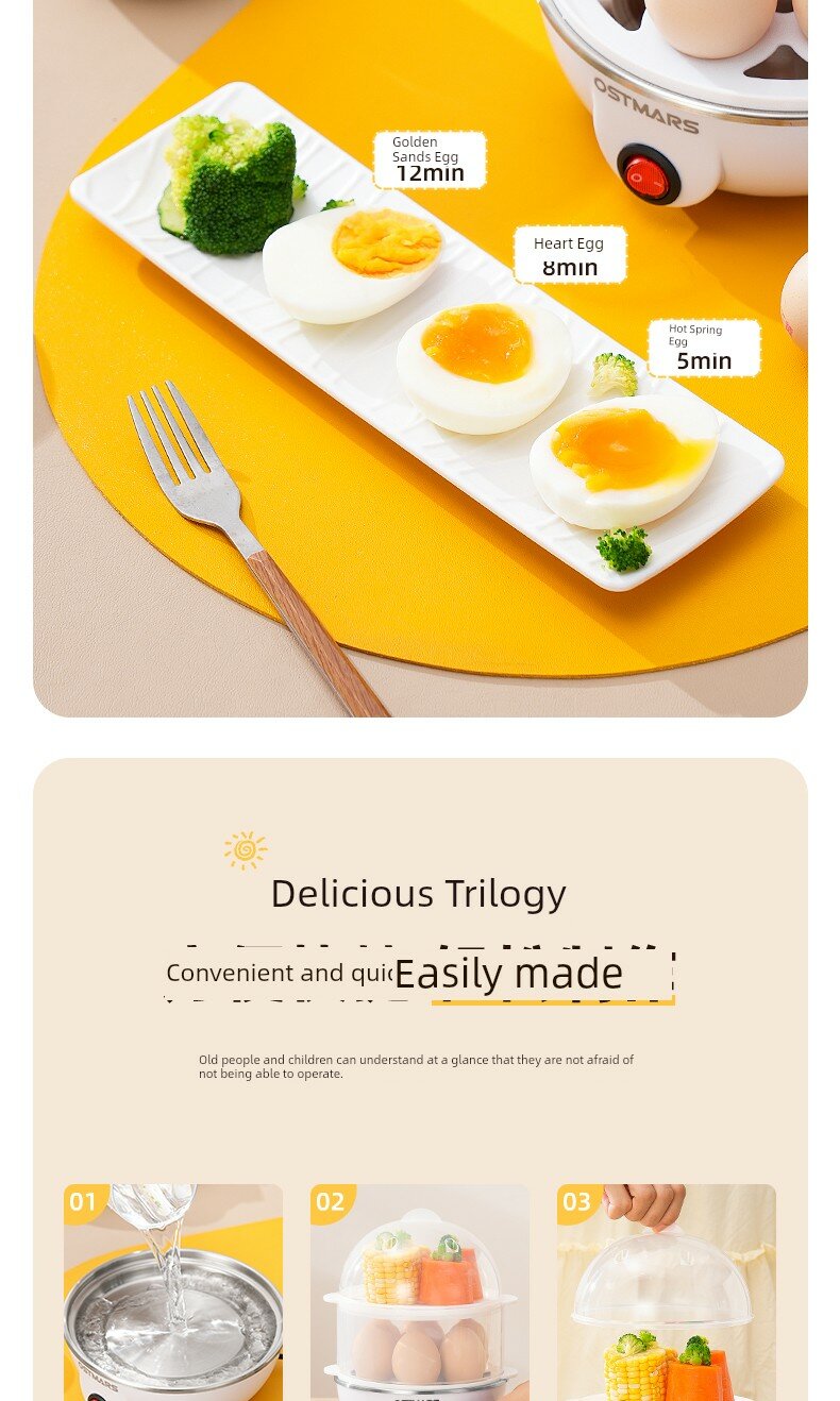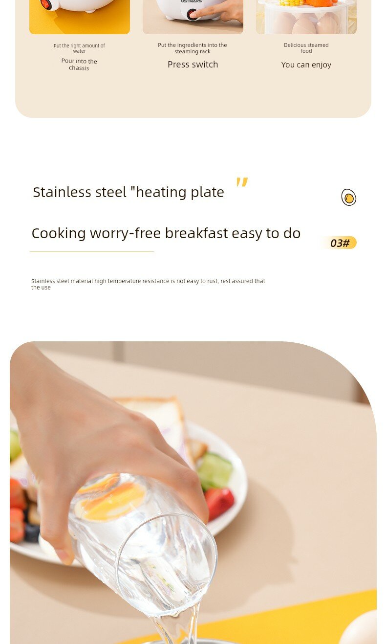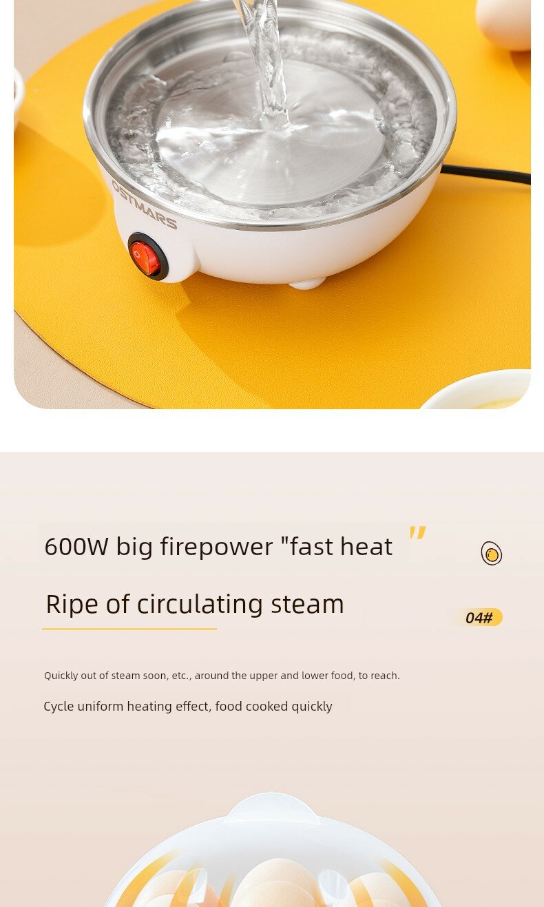 | Дополнительная информация | двухслойная конструкция, можно готовить 14 яиц одновременно, многофункциональный нагрев, автоматическое отключение при выкипании воды, материалы, контактирующие с пищевыми продуктами, равномерный нагрев на 360 градусов, можно готовить яичный заварной крем/сладкий картофель/кукурузу/морские гребешки, защита от выкипания, нагревательная пластина из нержавеющей стали, высокая термостойкость, подставка для яиц из полипропилена, защита от отключения при высокой температуре |