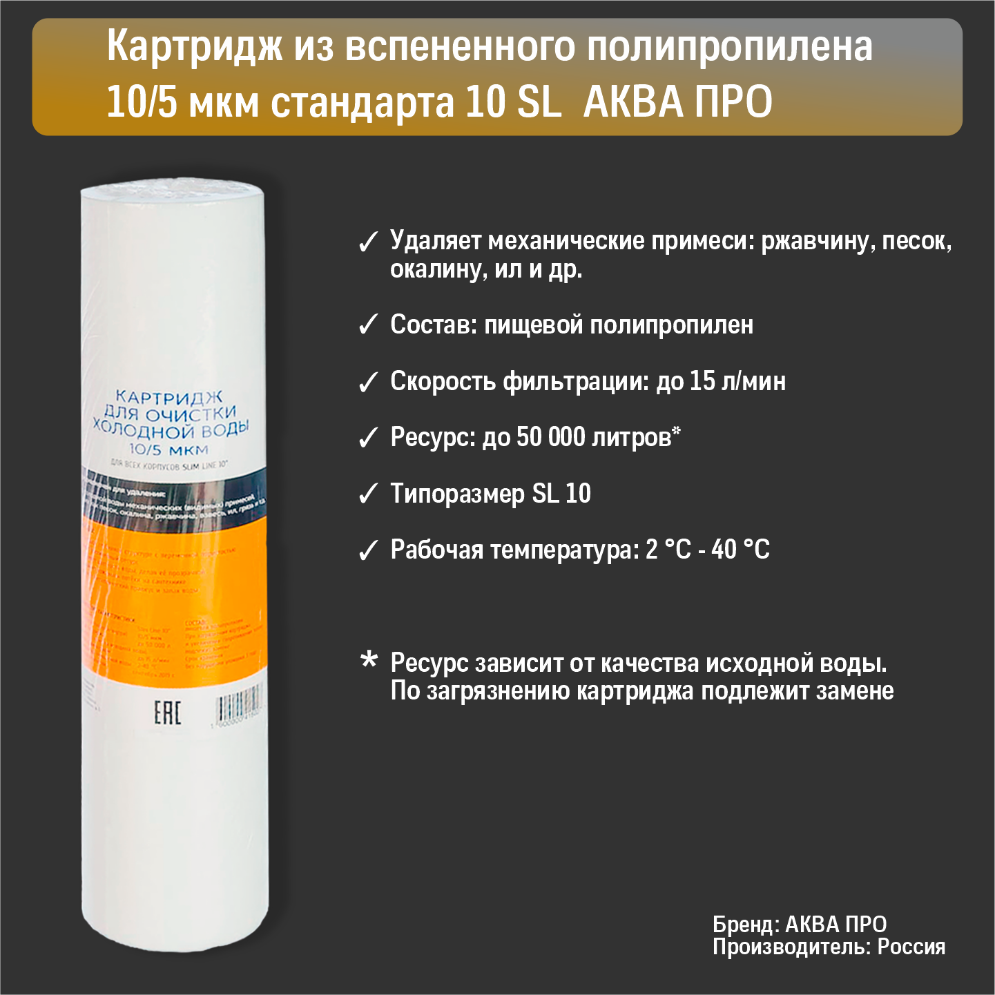 Картридж из вспененного полипропилена АКВАТЕК ЭКО 10" SL для хол воды 50 мкм