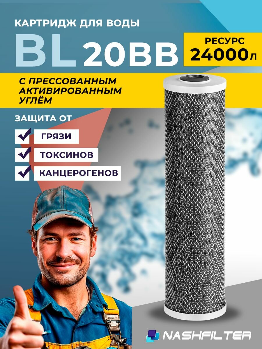 Картридж угольный для фильтра NASHFILTER BL 20BB из прессованного угля, для сорбционной очистки воды (от хлора и органических соединений), Big Blue 10, интересное: