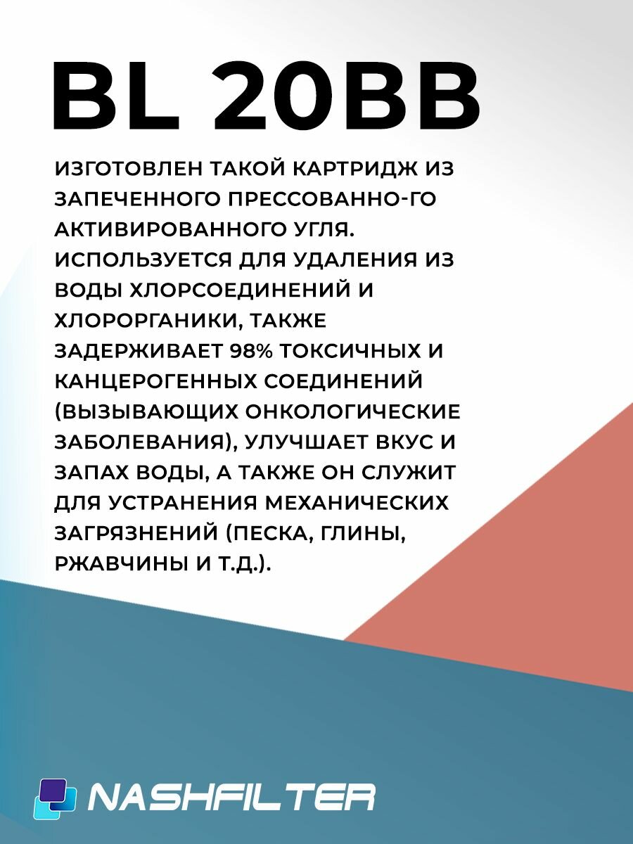 Картридж для фильтра угольный NASHFILTER BL 20BB из прессованного угля, для сорбционной очистки воды (от хлора и органических соединений) 3 шт интересное: