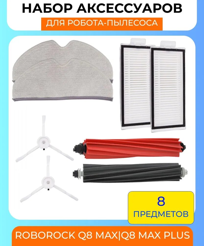 Набор аксессуаров для робота-пылесоса Xiaomi , Roborock Q8 Max/Q8 Max Plus : салфетка из микрофибры 2 шт, HEPA-фильтр 2 шт, боковая щетка белая 2 шт, основная щетка 2 шт.(черная и красная) интересное: