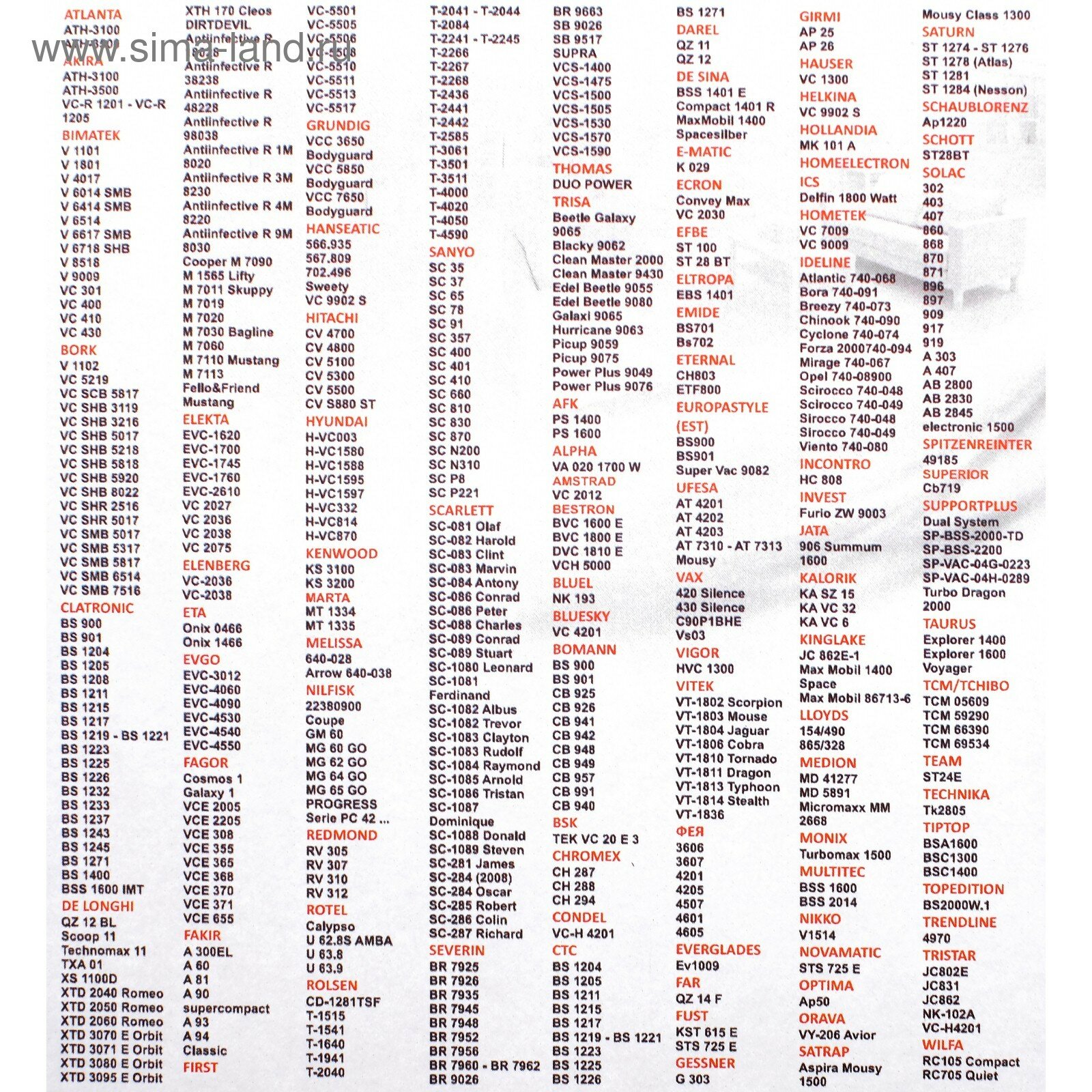| Совместимые модели | Atlanta, Beko, Bimatek, Bork, Cameron, Clatronic, Elekta, Elenberg, Evgo, Hitachi, Polar, Polaris, Rolsen, Sanyo, Scarlett, Severin, Shivaki, Trony, Vitek, Фея |