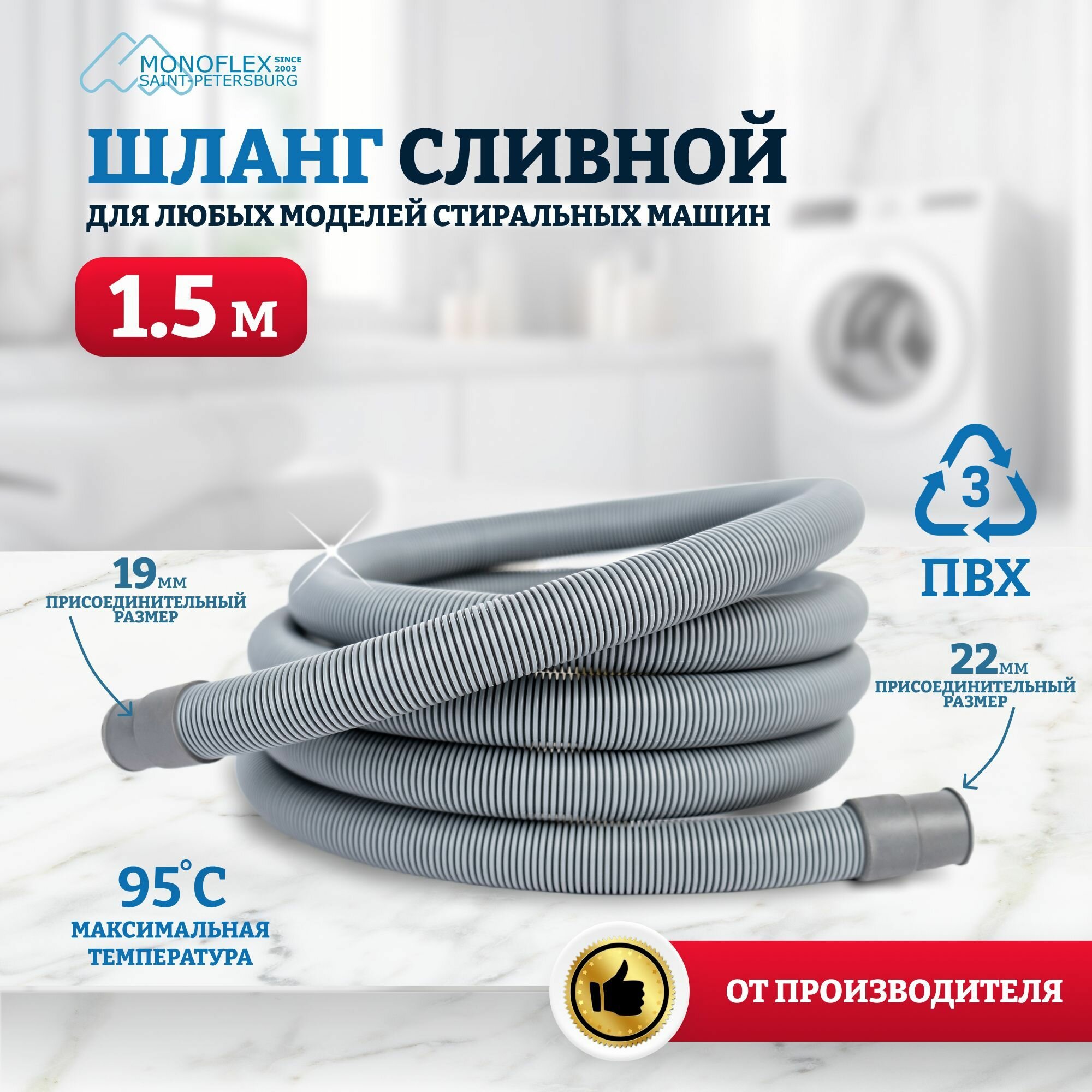 Шланг для стиральной машины сливной 1,5м (150см) MONOFLEX PVC ПВХ, 1шт/уп интересное: