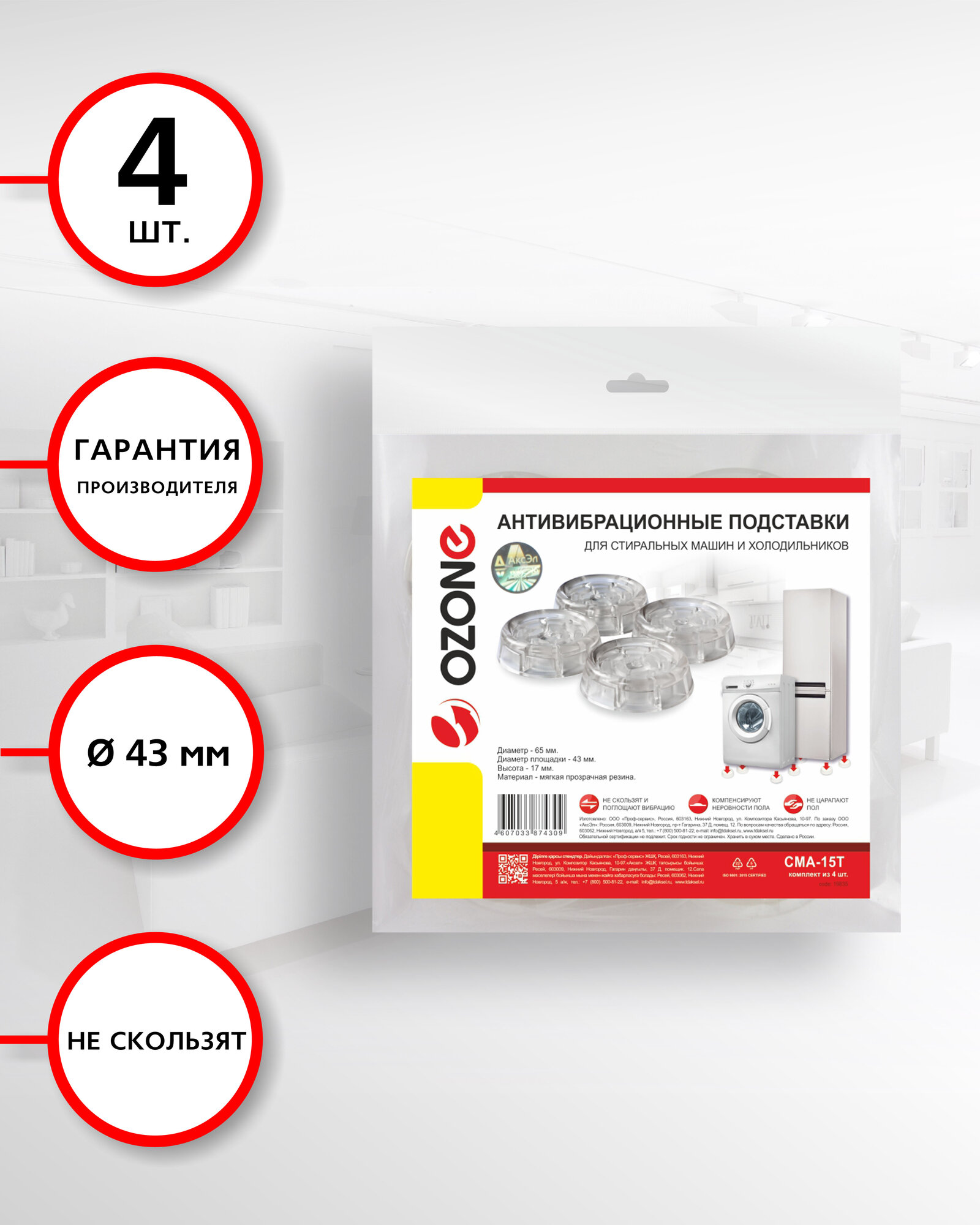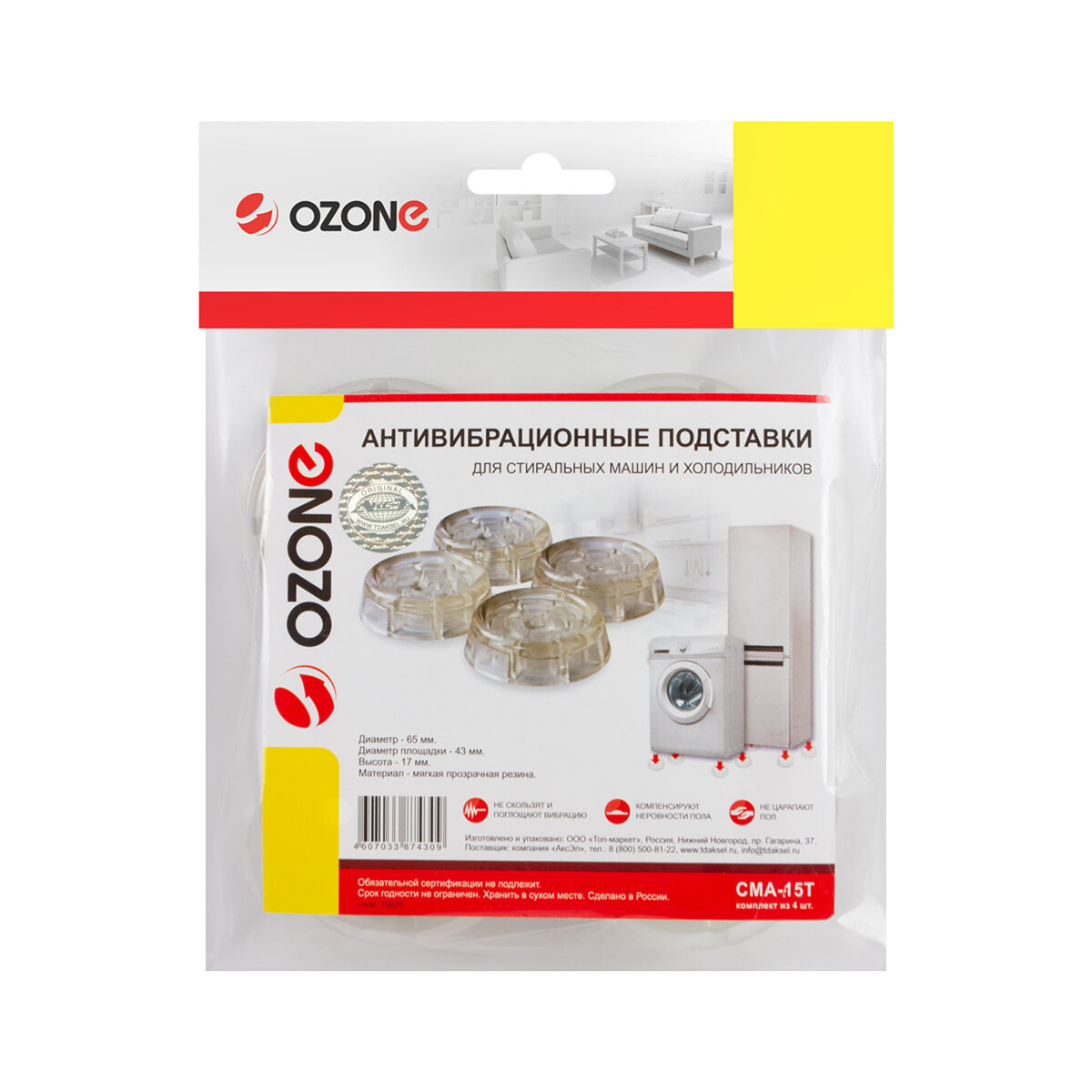 Купить Антивибрационные подставки для стиральных машин и холодильников, 4 шт, цвет прозрачный, круглые, бренд: OZONE, CMA-15T