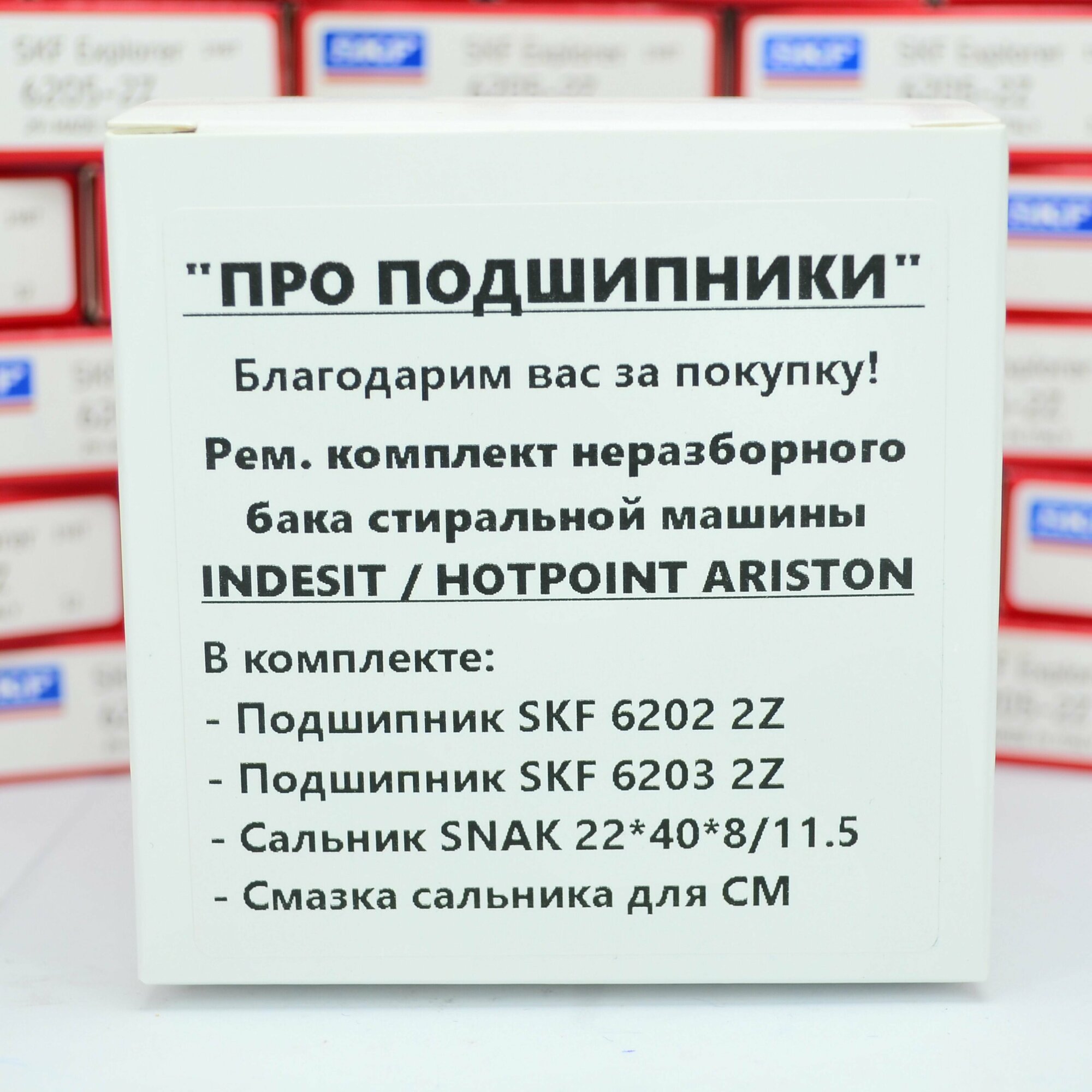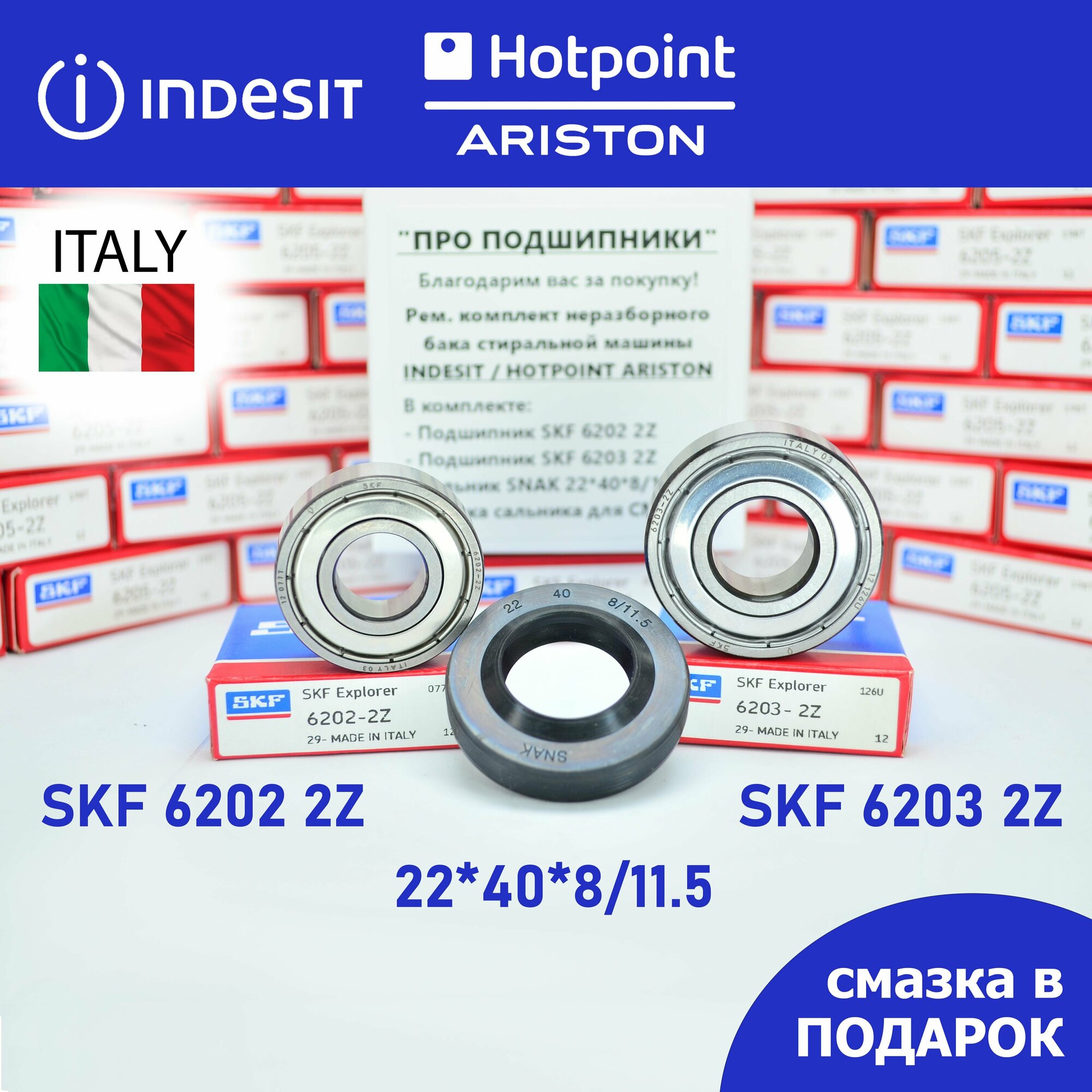 Купить Ремкомплект неразборного бака для стиральной машины Indesit, Hotpoint Ariston SKF 6202 2Z, 6203 2Z, сальник 22*40*8/11.5 + смазка