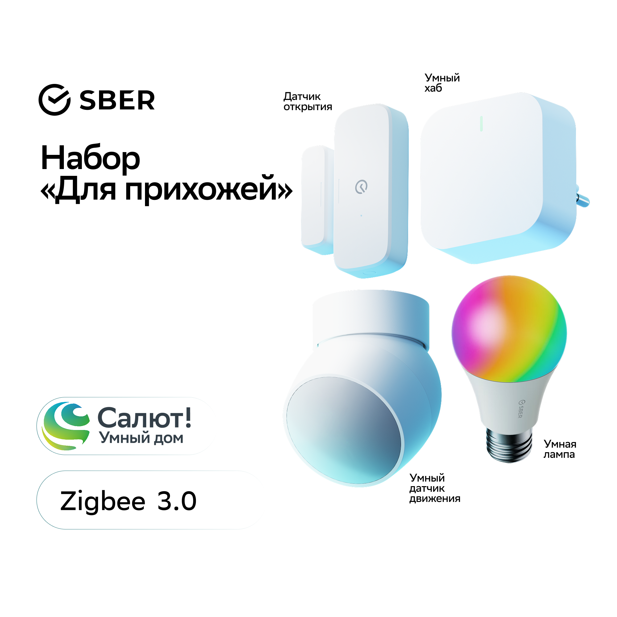 Комплект девайсов Умный дом Sber. Набор для прихожей (Хаб Zigbee, Датчик движения, датчик открытия, умная лампа) интересное: